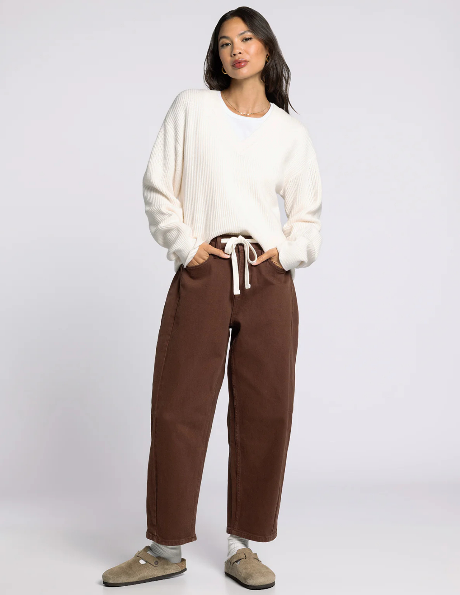 Step into comfort and style with the Anees Pants in Coffee. Featuring a playful barrel leg fit, a cozy drawstring waist, and a slightly cropped length, these pants bring a fresh twist to your denim collection. Perfect for easygoing days, they blend relaxed vibes with a cool, classic look you’ll reach for again and again.