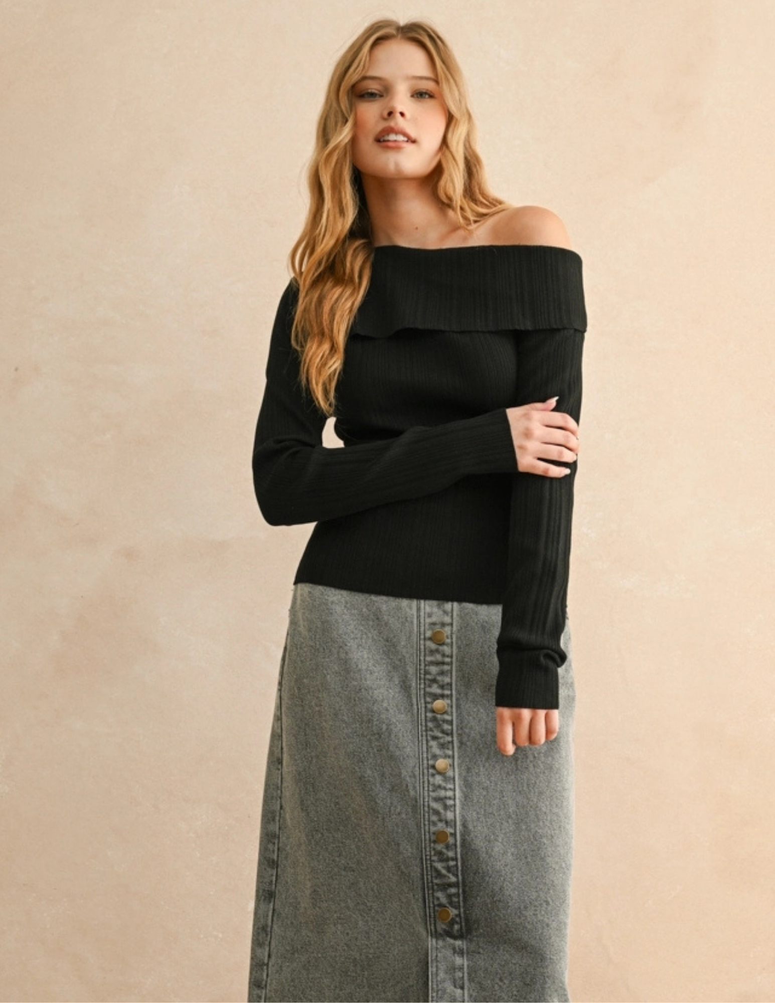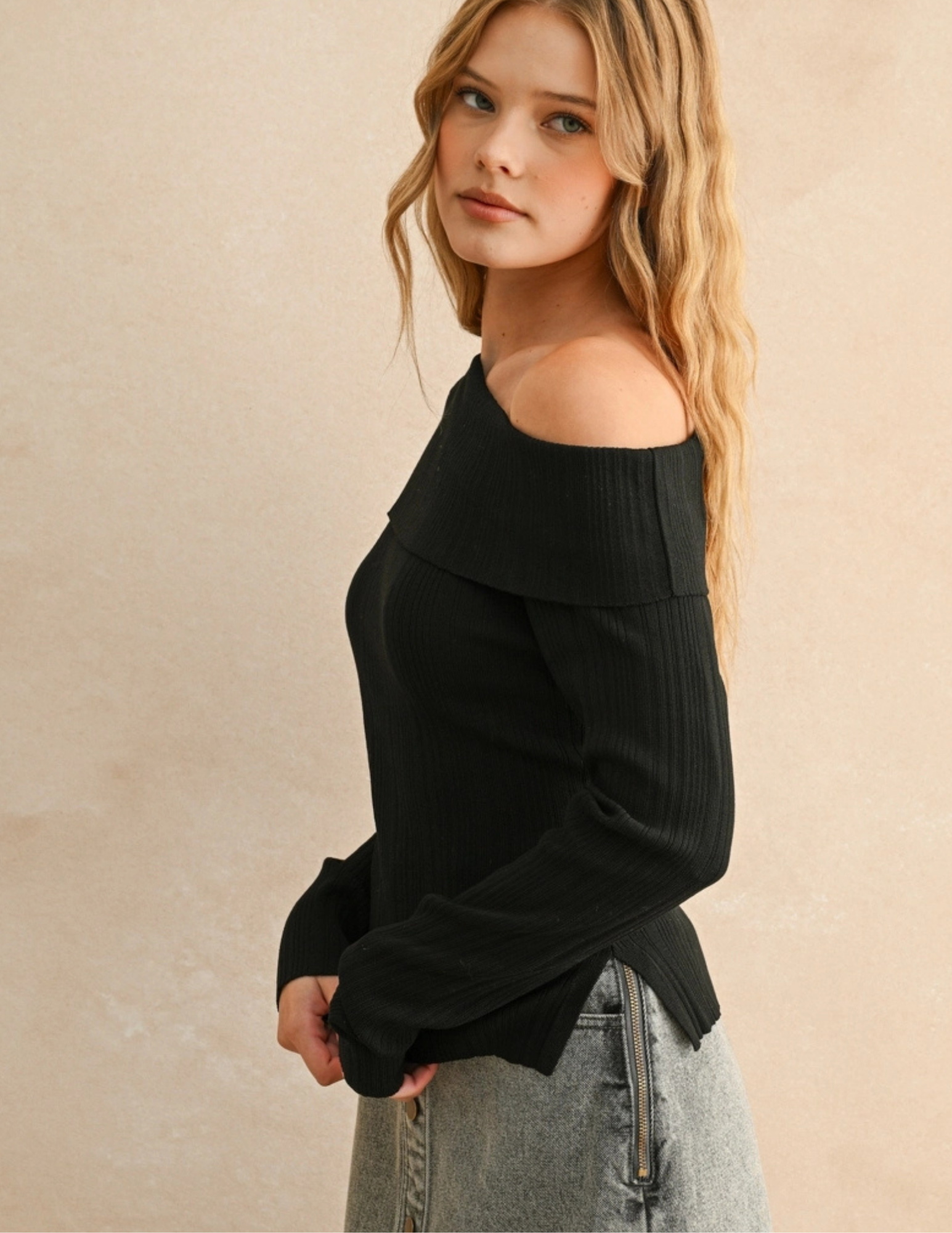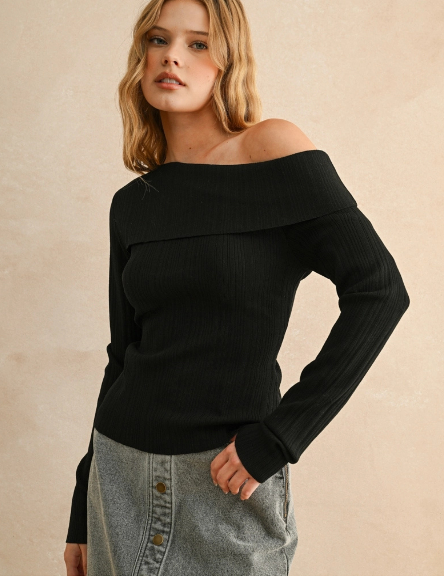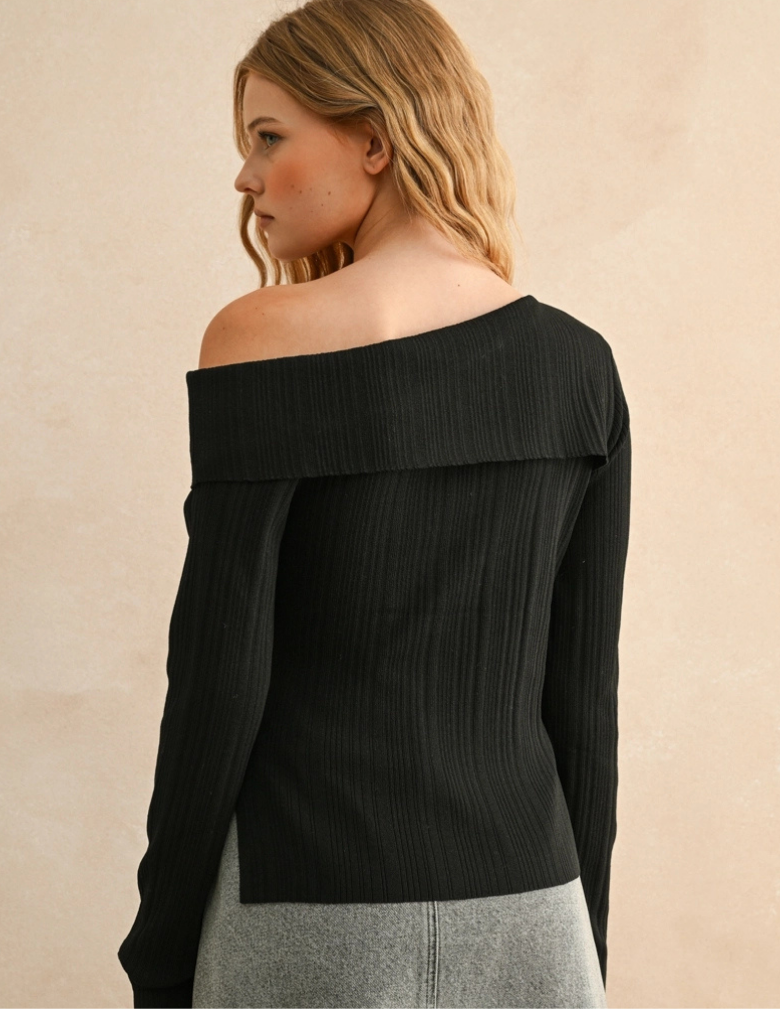 Elevate your wardrobe with this playful black ribbed top featuring an eye-catching asymmetric shoulder design. The long sleeves keep it cozy, while the unique cut adds a flirty twist to your everyday look. Perfect for turning heads whether you’re out with friends or lounging in style.