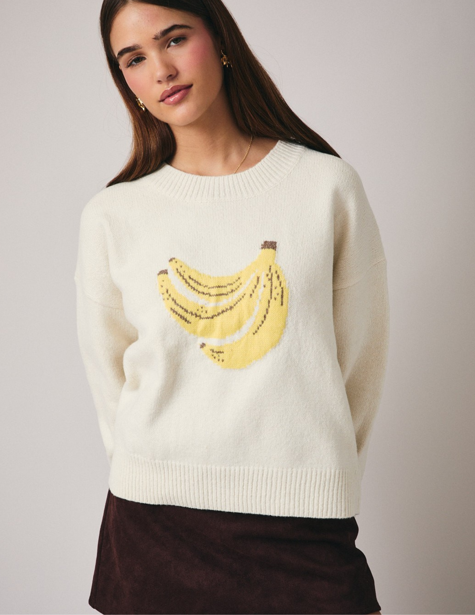 Slip into something fun with this playful banana graphic sweater. Featuring a bold, eye-catching design on a cozy knit base, it's the perfect piece to add a splash of personality to your everyday rotation. The classic round neckline and long sleeves offer timeless comfort, while the graphic keeps things lighthearted and fresh. Whether you're layering for cooler days or making a statement on its own, this sweater brings a cheerful vibe to any casual outfit.