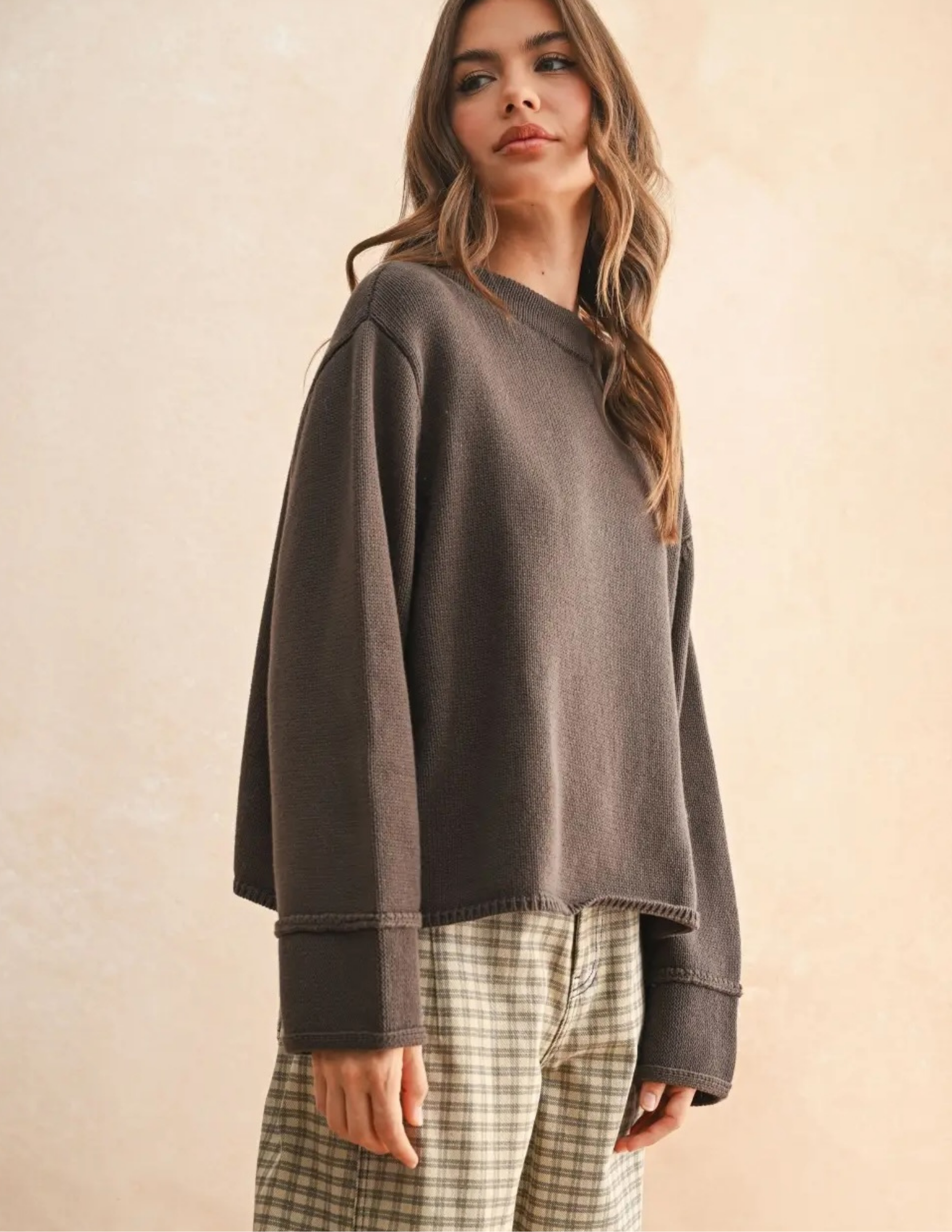 Cozy up in this brown sweater featuring charming oversized sleeves that make a statement. For the perfect fit that’s snug but stylish, we suggest sizing down. It’s the ultimate blend of comfort and playful flair for your wardrobe!