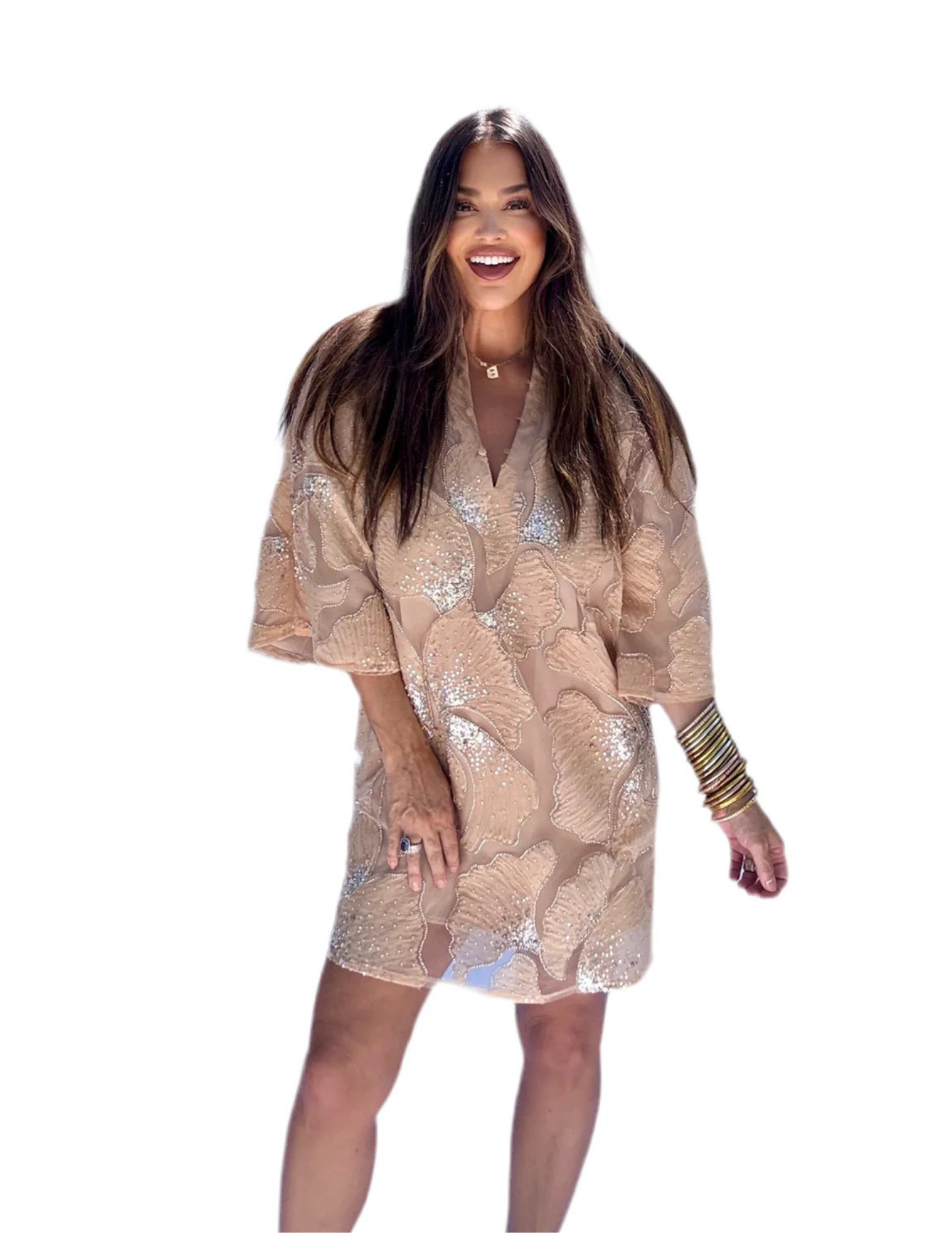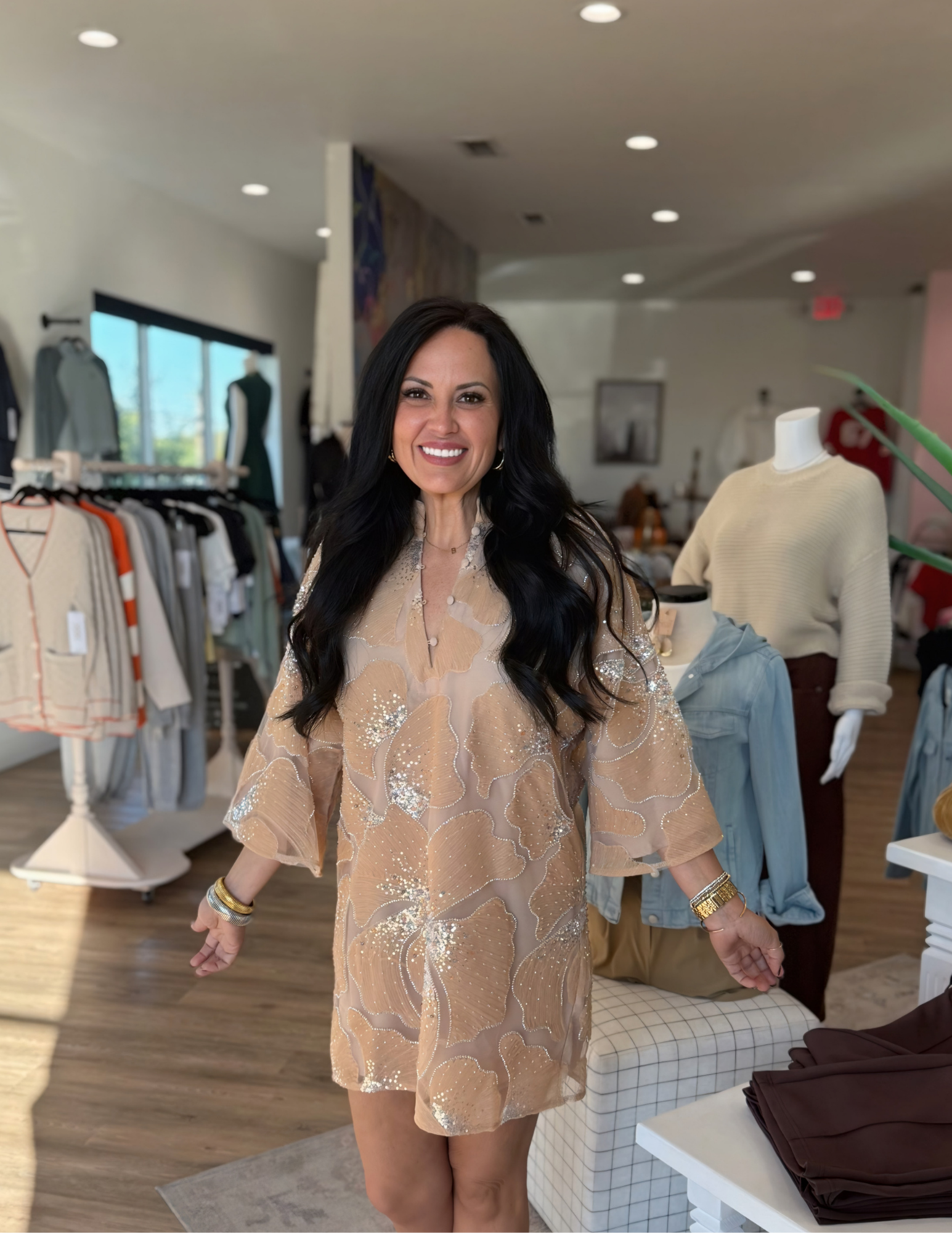Step into the spotlight with the BuddyLove Madison Sand mini dress. Featuring a vibrant pink floral print named “Sand,” it blends playful neutrals with a subtle sparkle. Designed to flatter your shape, this dress offers a feminine drape and comfortable fit—ideal for dancing the night away or turning heads at any occasion.