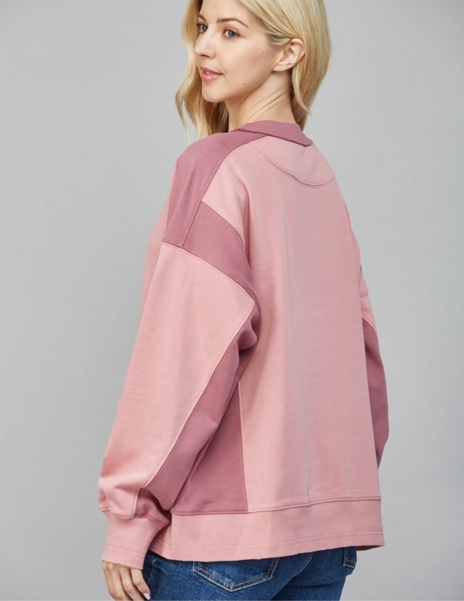 Layer up in style with this eye-catching colorblock sweatshirt featuring bold mauve tones and trendy exposed seaming details. The modern color-blocking creates visual interest while the signature seam accents add an edgy, contemporary vibe. Perfect for casual days when you want to make a fashion statement without trying too hard. Cozy comfort meets runway-inspired design in one versatile piece.