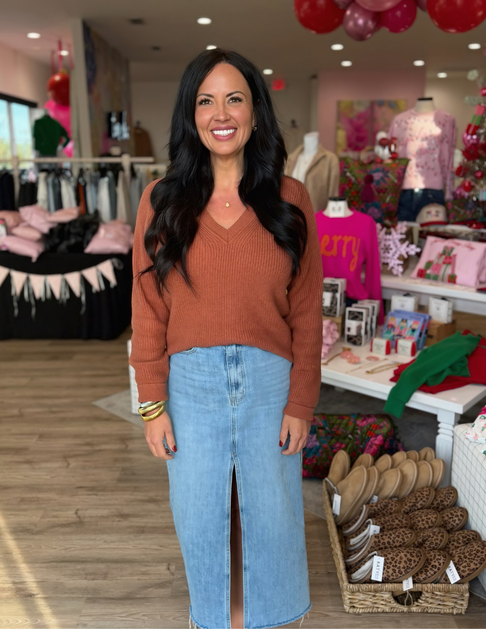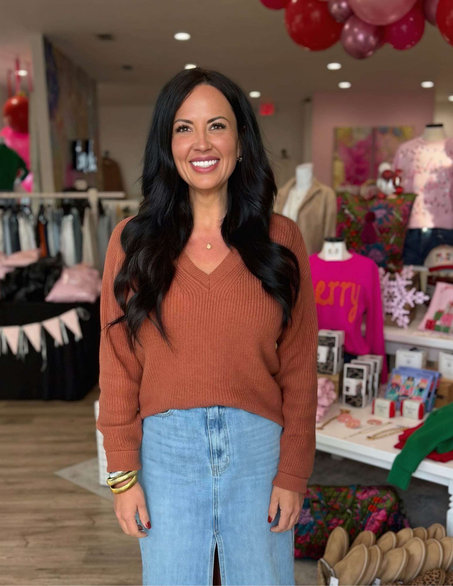 Wrap yourself in effortless comfort with the Cornelia Sweater in Rustic Brown. This slouchy essential features a flattering V neckline and relaxed drop shoulders that feel like a warm hug. The ribbed knit construction adds texture and dimension while keeping things cozy and casual. Perfect for layering or wearing solo, it's the sweater you'll reach for again and again.