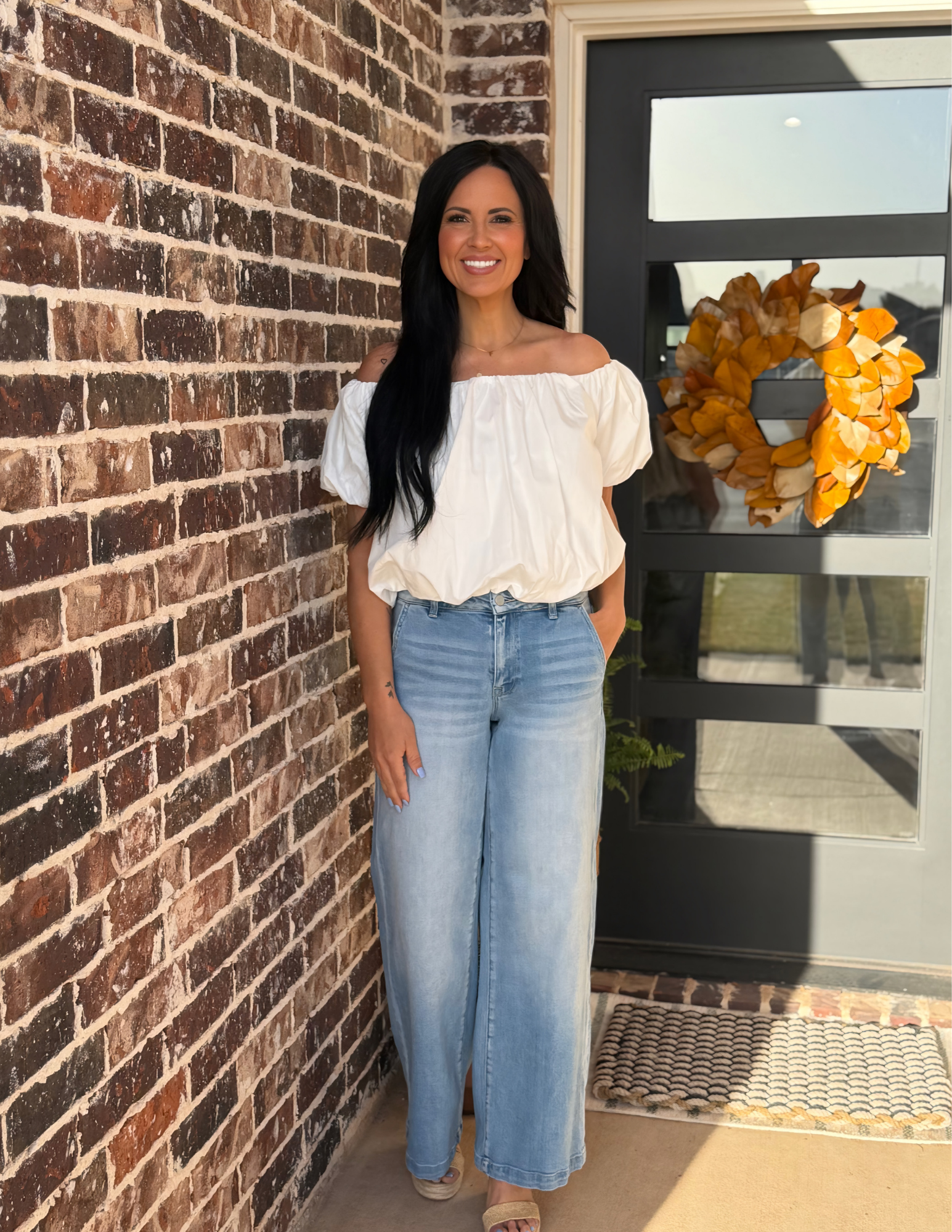 Effortless elegance meets comfort in this charming cotton balloon blouse. The off-the-shoulder neckline and short puff sleeves create a romantic silhouette, while elastic shirring at the front adds subtle texture and visual interest. Fully lined with a bubble hem and covered elastic cuffs for a polished finish. Crafted from 100% breathable cotton, this skin-friendly top offers a casual yet flattering fit perfect for everyday wear or weekend outings.