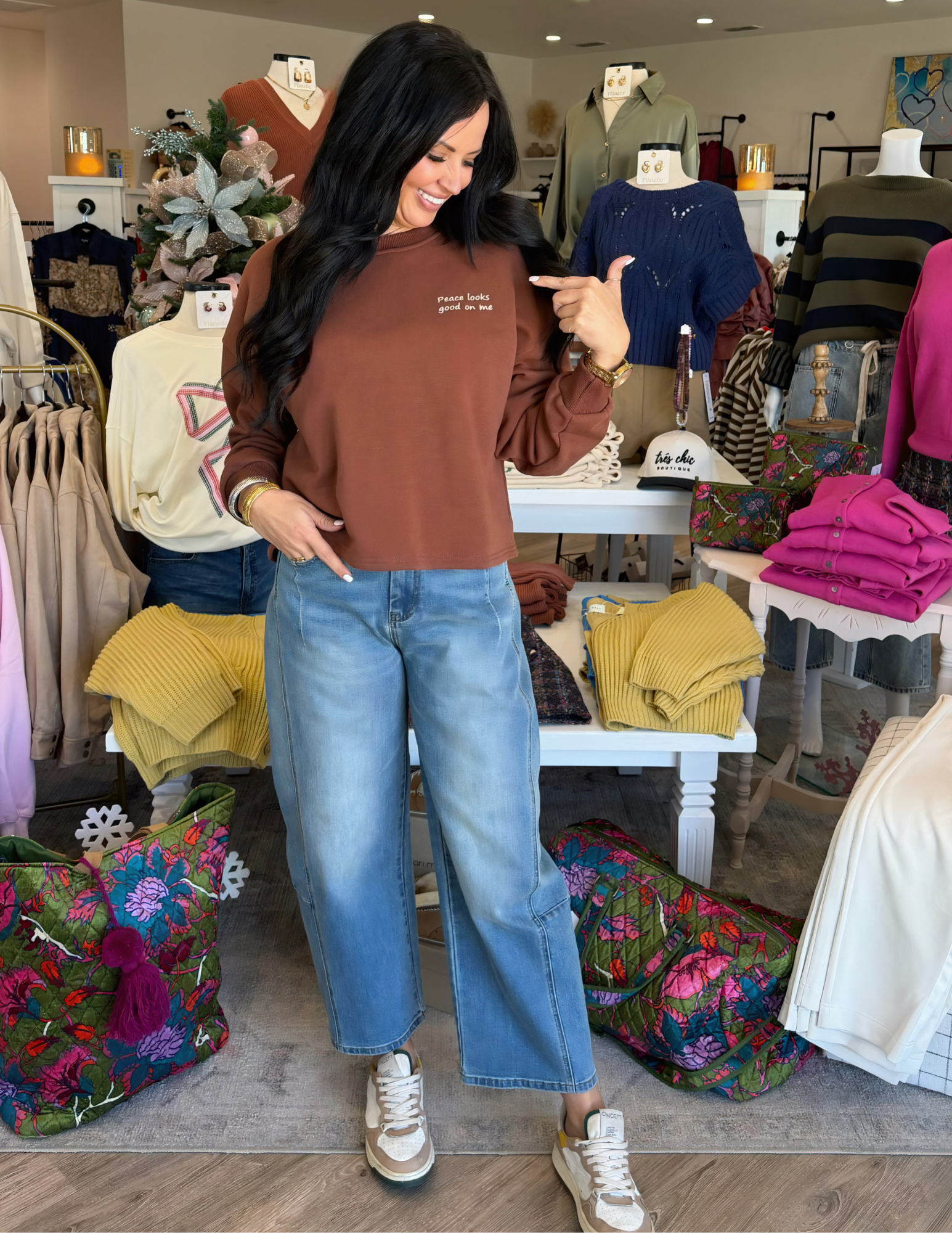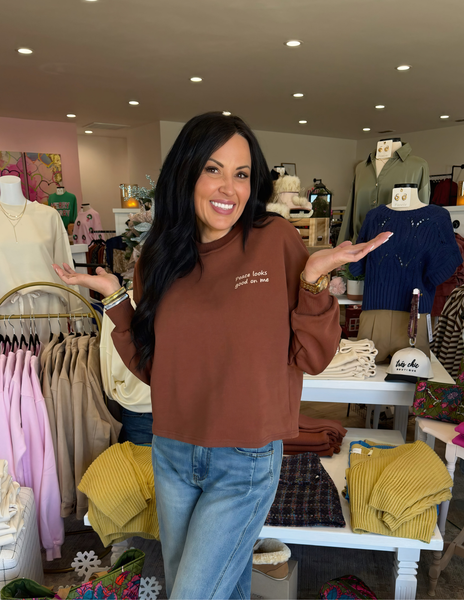 Spread good vibes in this cozy crew neck sweatshirt featuring a "peace looks good on me" message that says it all. Adorable flower patches at the elbows add a charming, artistic touch, while the slightly cropped silhouette keeps things modern and flattering. Perfect for casual days when you want to look effortlessly cool while radiating positivity. Soft, comfortable, and unapologetically you.