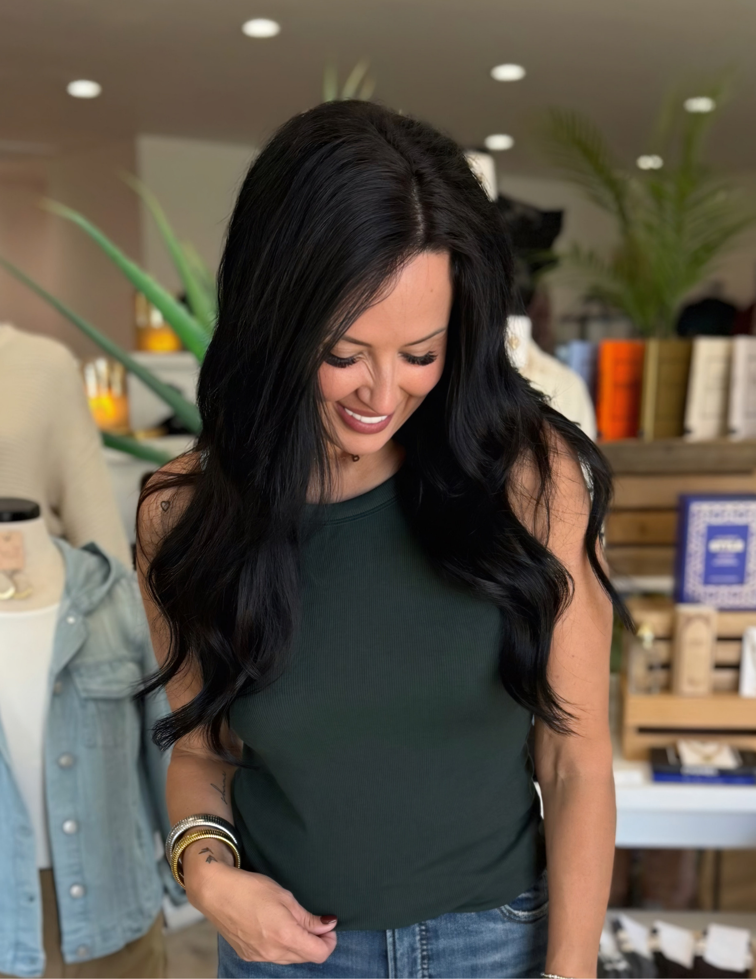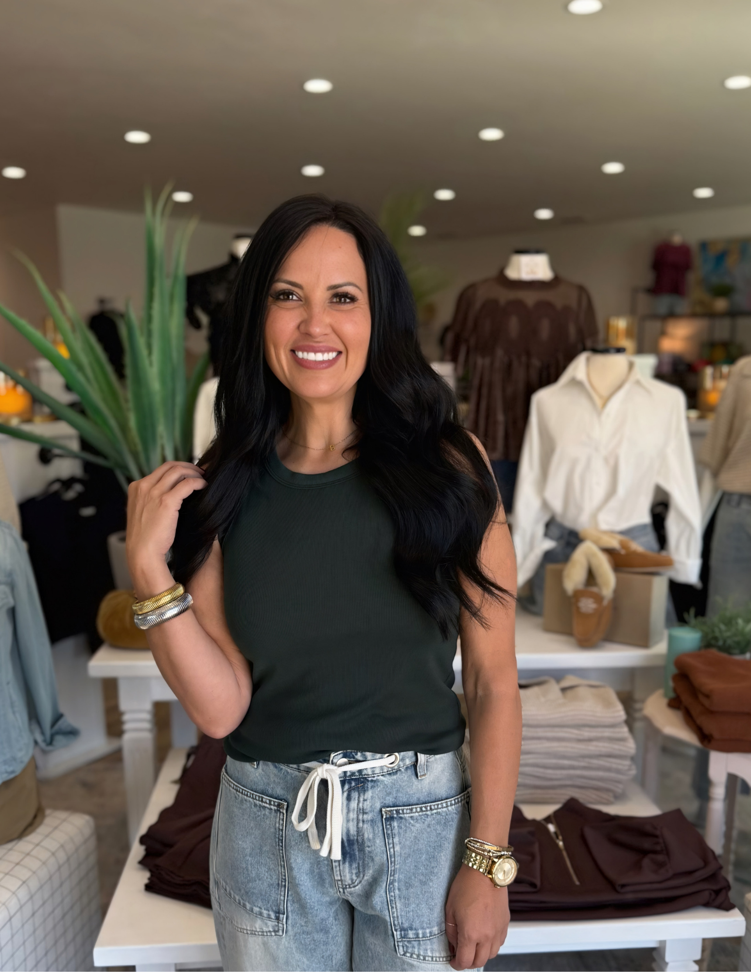 This crew neck ribbed knit tank in hunter green is your new go-to for casual cool. Sleeveless and comfy, it’s perfect for layering or rocking solo on easy, everyday days. Soft, stretchy, and effortlessly stylish — it’s basic never felt this good!
