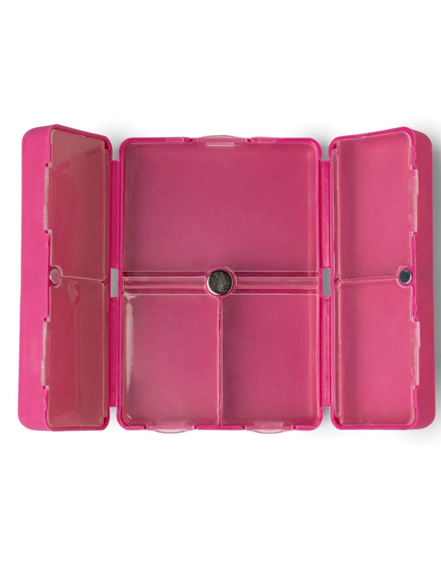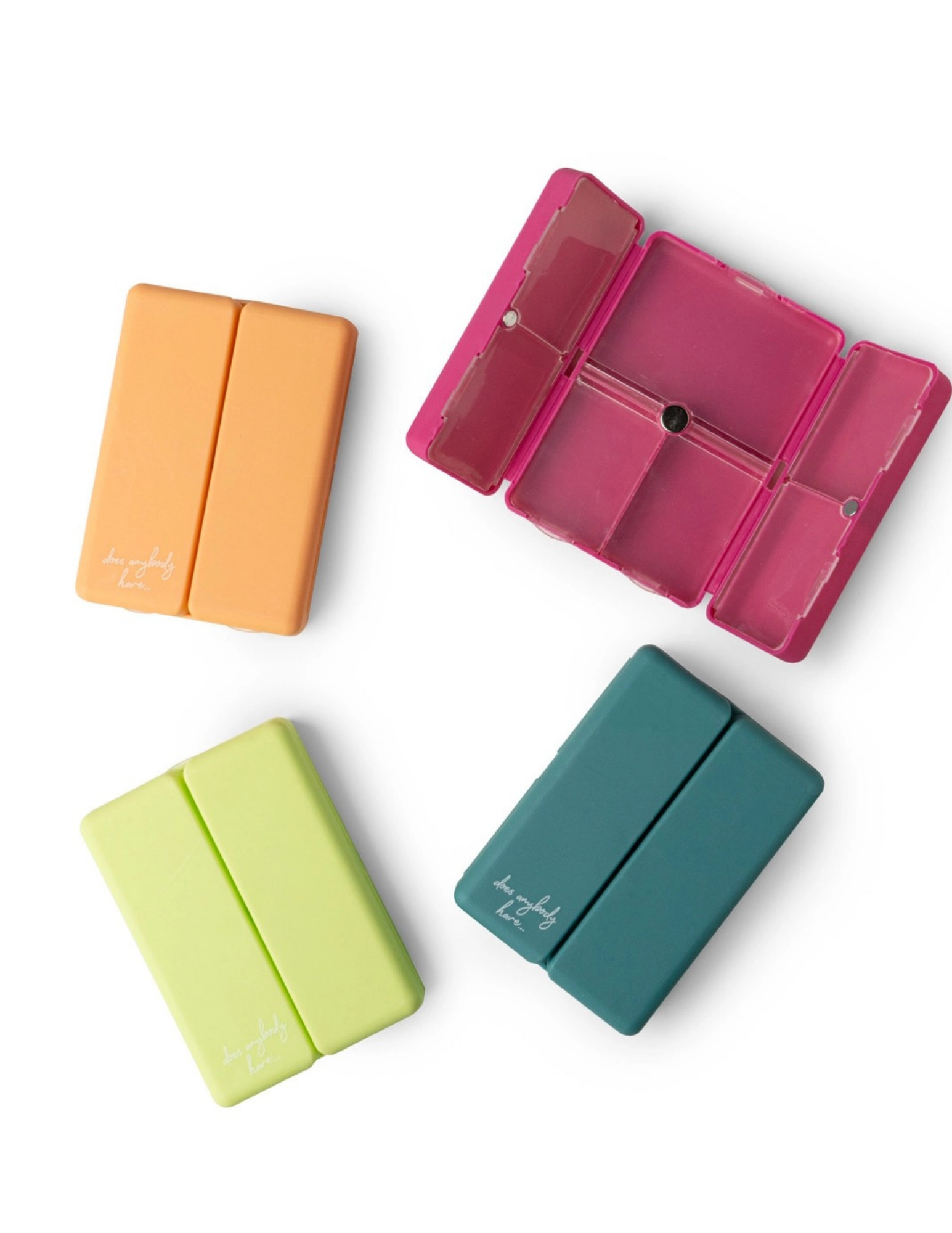 Stay organized with Crush Everything's Fine Pill & Vitamin Case—your new pocket-sized wellness companion. Choose from vibrant peach, teal, lime, or magenta, then customize with included sticker sheets to label each of the seven snap-close compartments. The secure magnetic closure keeps everything locked in place, while the compact design fits perfectly in your purse or pocket. Because taking care of yourself should be effortless and fun.