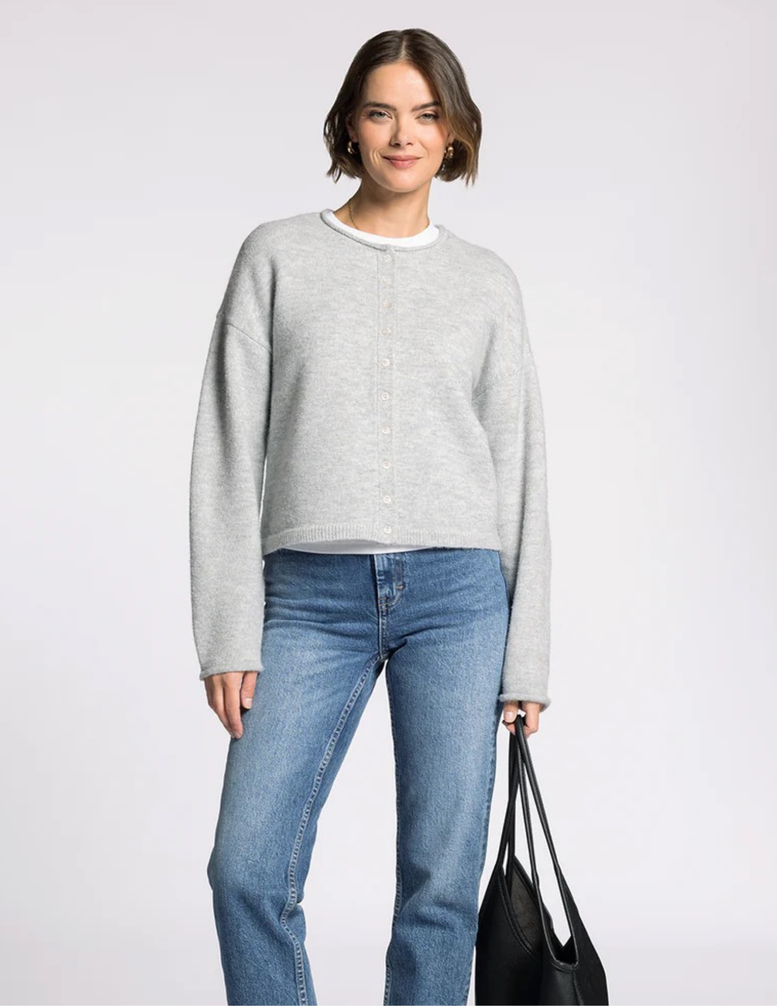 Wrap yourself in pure comfort with the Drover Cardigan in Light Heather Grey. This relaxed-fit essential features our signature cozy yarn with charming rolled neck and sleeve details that add effortless style. The full button front makes layering a breeze, while the drop shoulder cut delivers that coveted laid-back vibe. Perfect for everything from coffee runs to casual weekends—your new favorite piece is here.