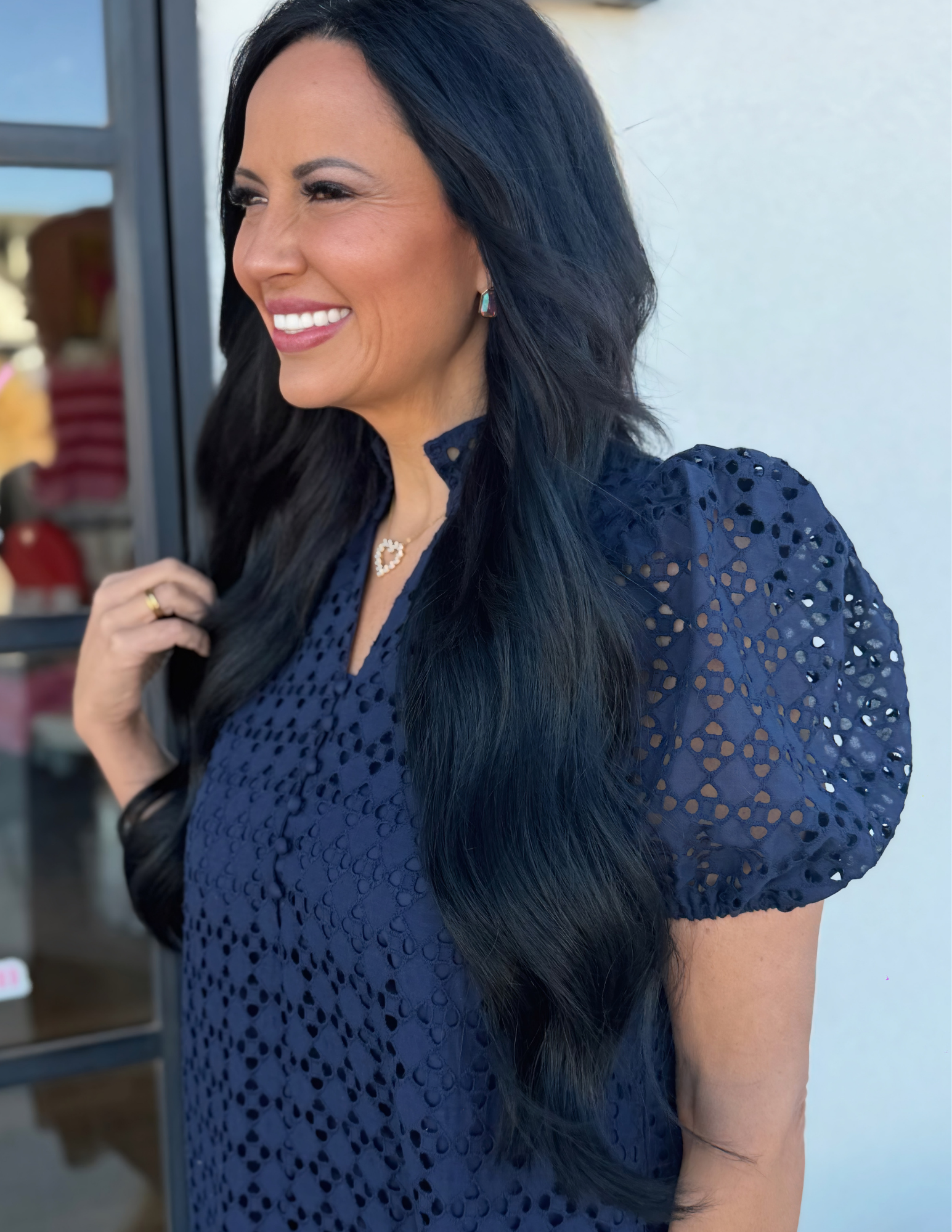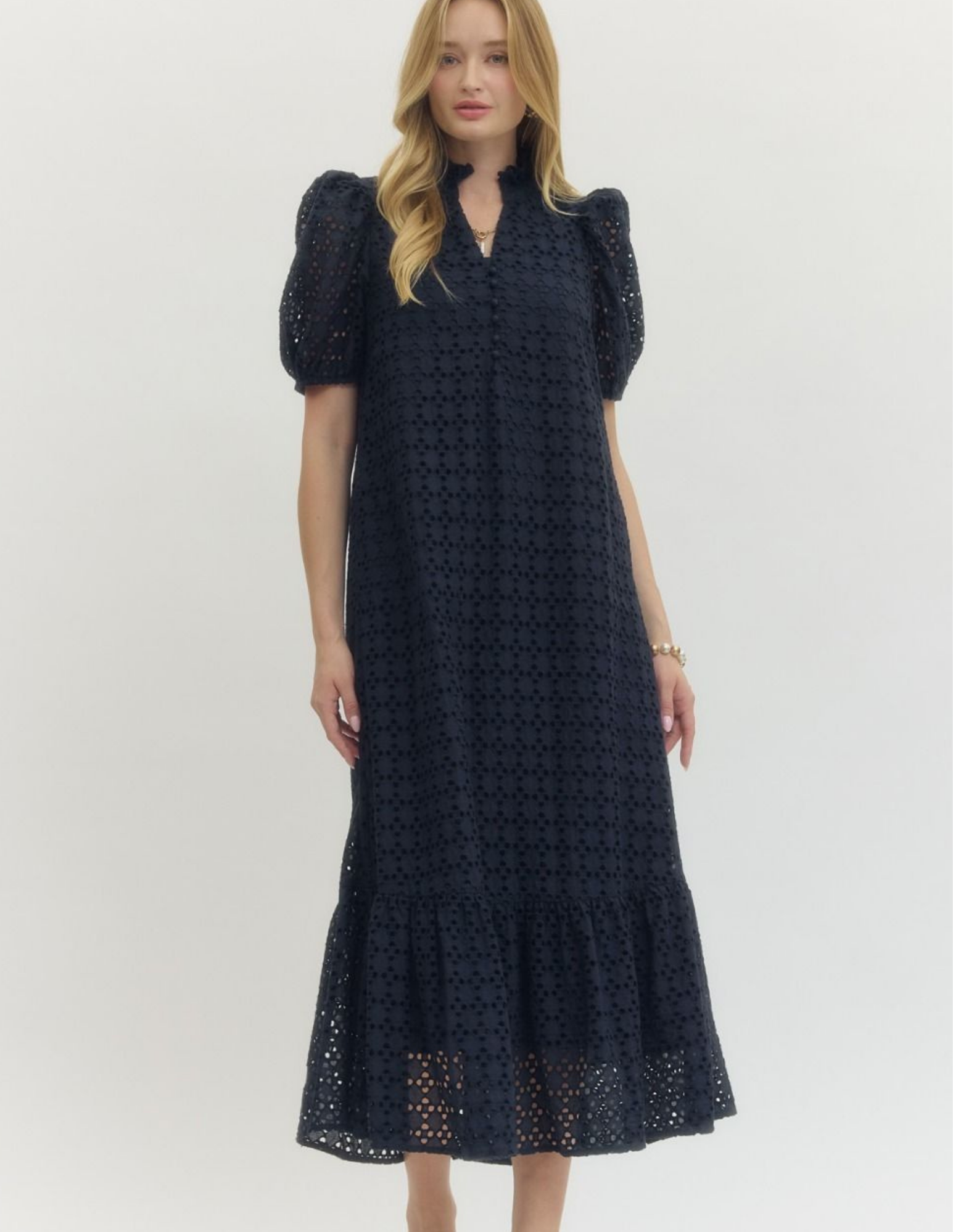 Twirl into elegance with this charming navy midi dress! Featuring delicate eyelet detailing, a sweet ruffled mock neck, and adorable puff sleeves, it's the perfect blend of feminine and fun. The front button closure and practical side pockets make getting dressed a breeze, while the lined, non-sheer woven fabric keeps things comfortable and sophisticated. Complete with a ruffled hem for extra flair, this lightweight beauty is ready for brunch dates, garden parties, or any occasion calling for effortless style.