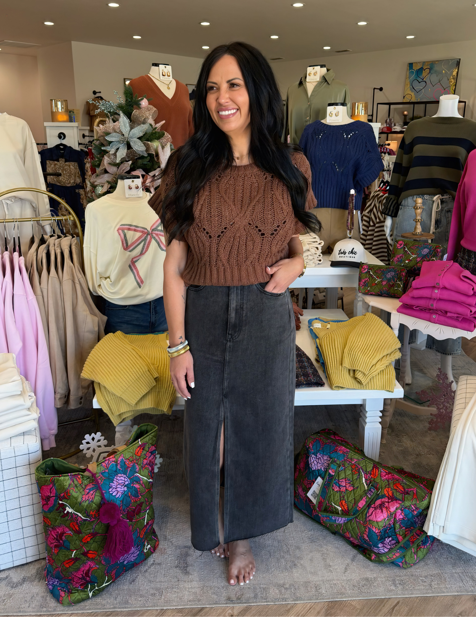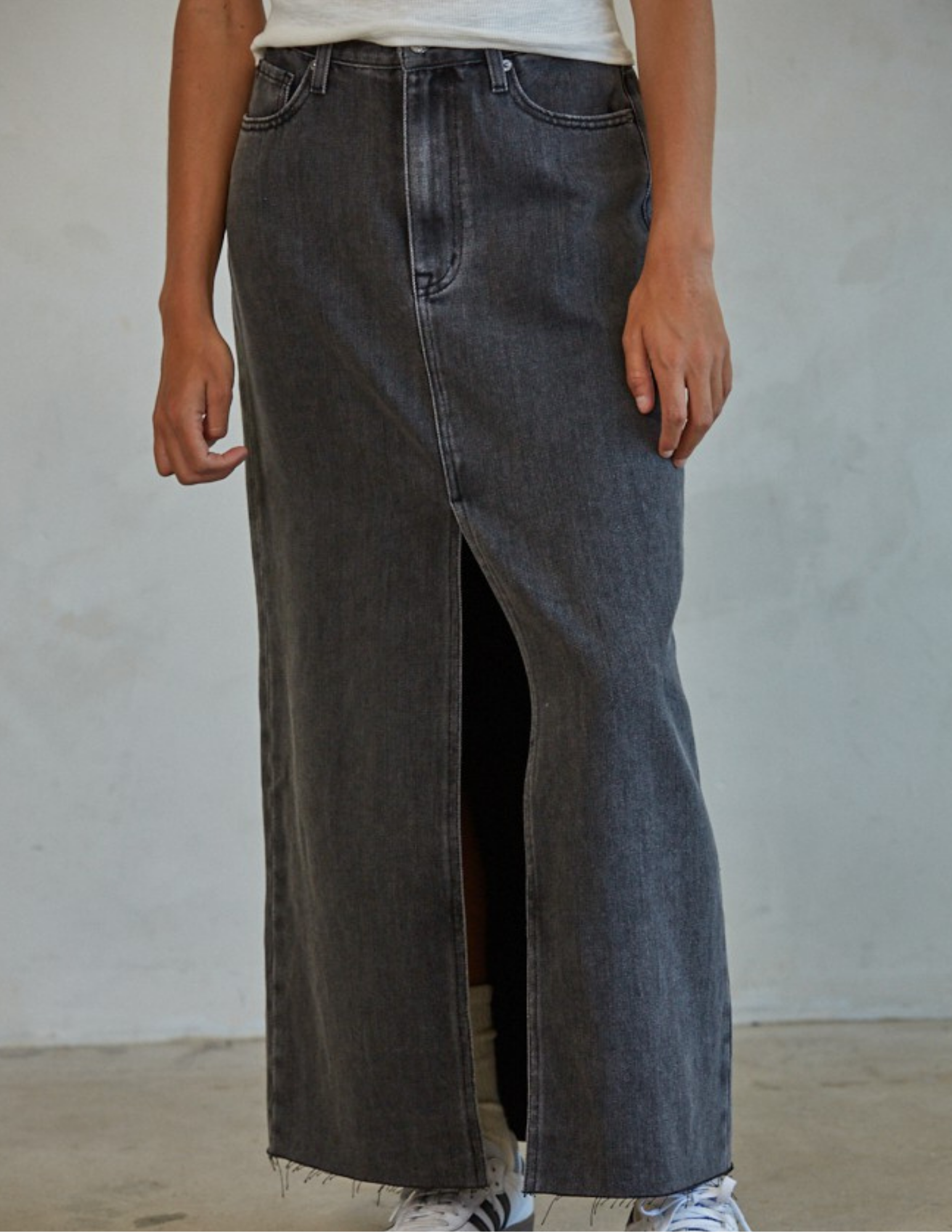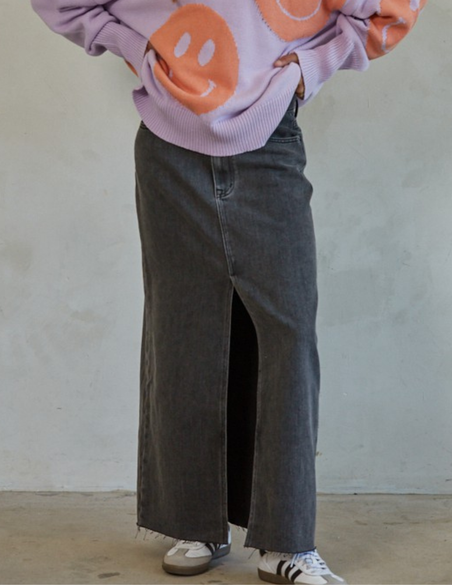 Step into the spotlight with the Fast Forward Skirt in classic black denim. This woven midi features a perfectly placed center front slit that adds movement and edge to your everyday look. The cut-off hem gives it an effortlessly cool vibe—think vintage meets modern. Whether you're dressing it up with heels or keeping it casual with sneakers, this skirt is your go-to piece for making a statement without trying too hard.