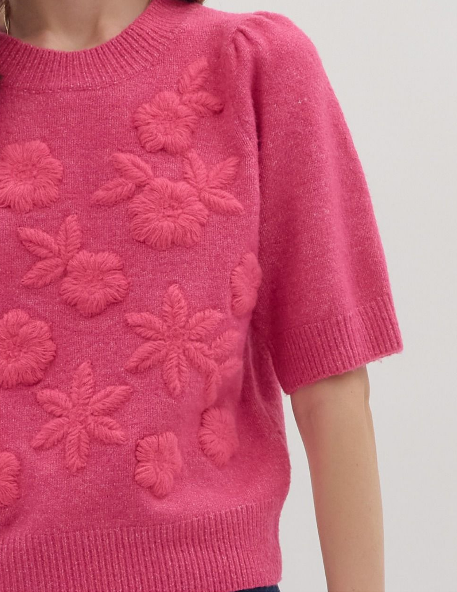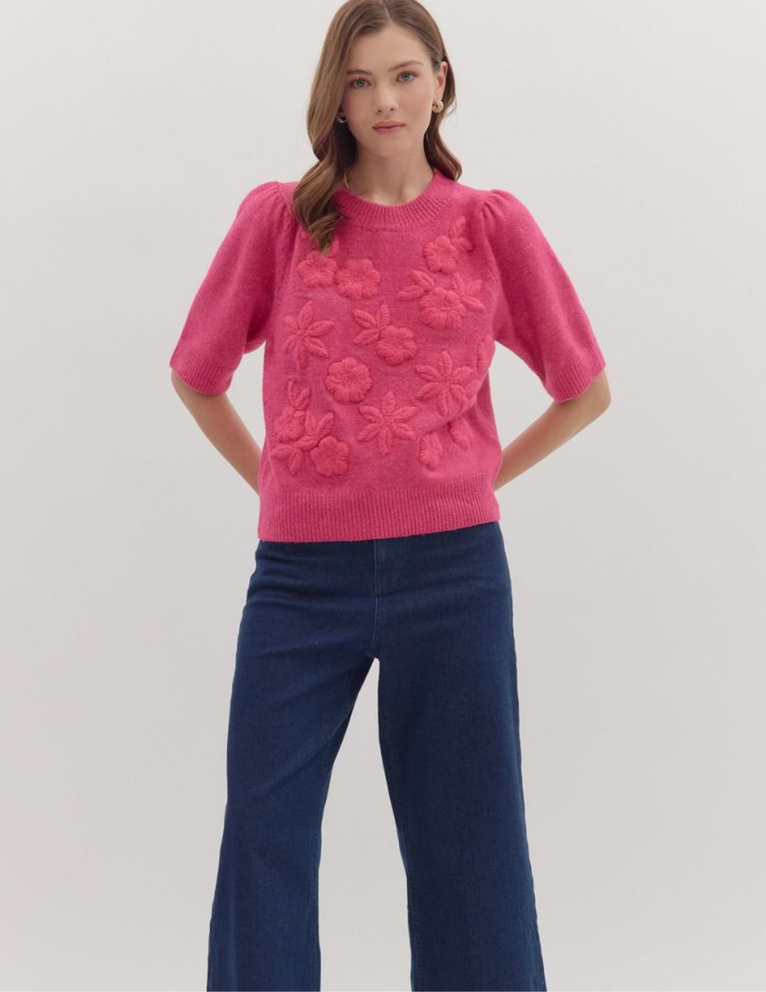 Brighten your wardrobe with this playful pink knit sweater, featuring charming floral appliques that add a touch of whimsy. The solid short puff sleeves bring a flirty vibe, while the medium-weight fabric keeps you cozy without bulk. Perfect for adding fun and flair to any casual look!
