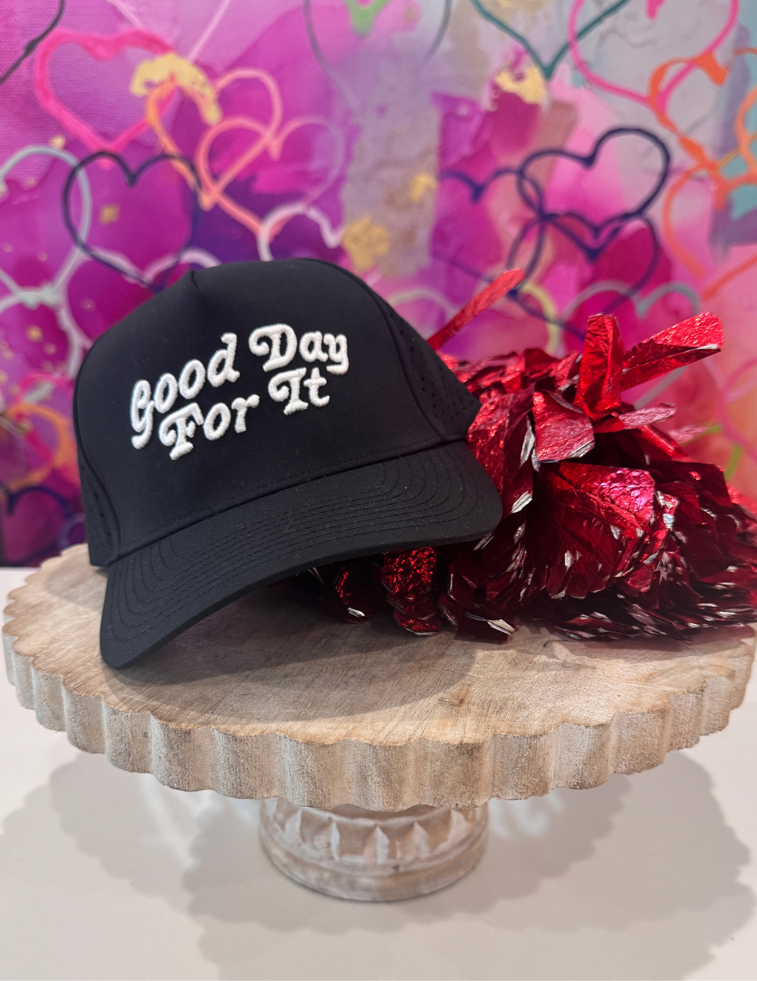 Bring a little fun to your look with the Good Day For It black snapback. This Tres Chic original features crisp white embroidery on a sleek black hat, perfect for turning heads. The adjustable snapback closure ensures a comfy fit all day long, making it a playful and stylish choice for any adventure.