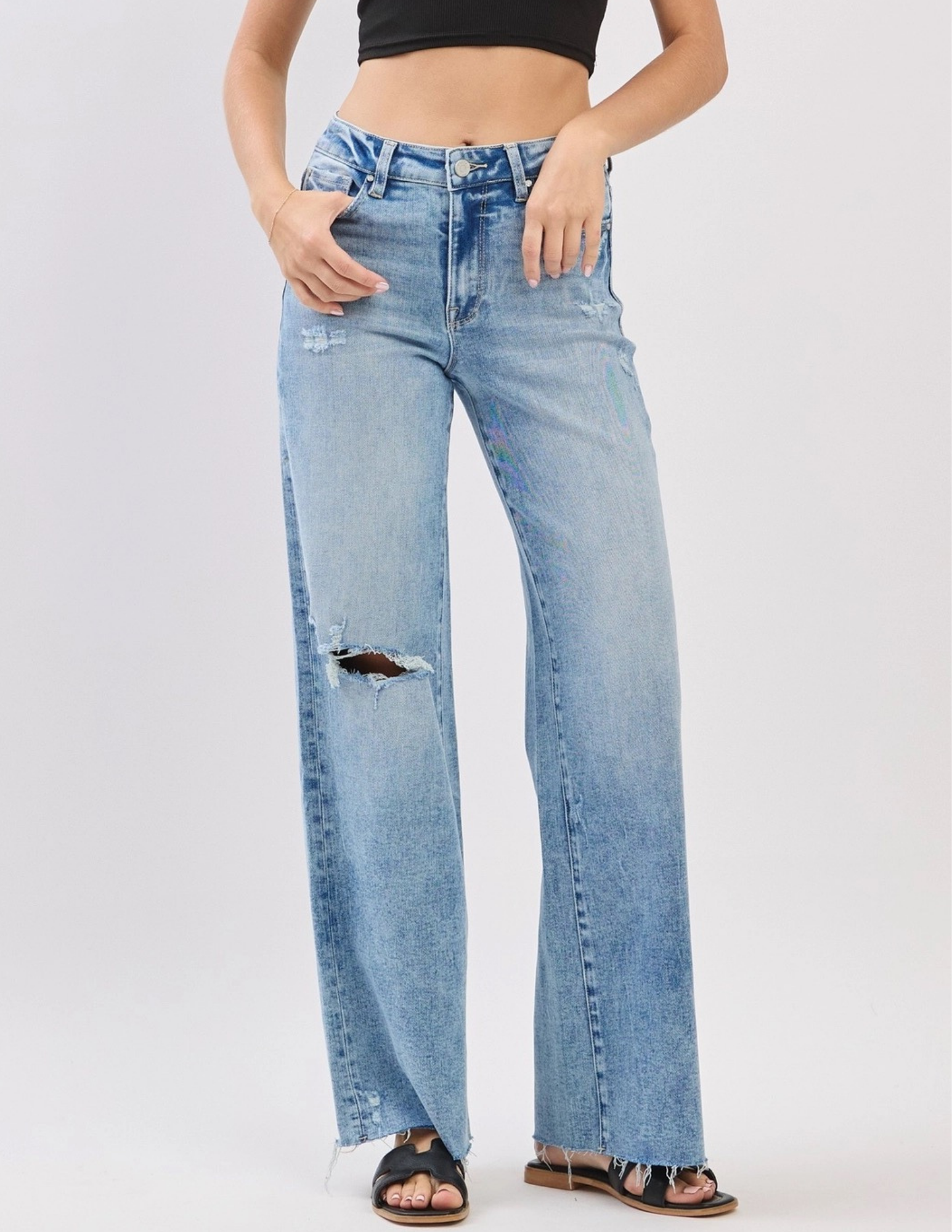 Meet your new denim obsession—a high-rise wide leg that's got serious attitude. With a 10" rise and roomy 22" leg opening, these jeans deliver that effortlessly cool silhouette everyone's after. The raw edge hem and knee-destroyed detailing add just the right amount of edge, while classic 5-pocket styling keeps things timeless. Button closure and zip fly for that authentic denim feel. Style them with everything from crop tops to oversized blazers and watch them become your go-to pair.