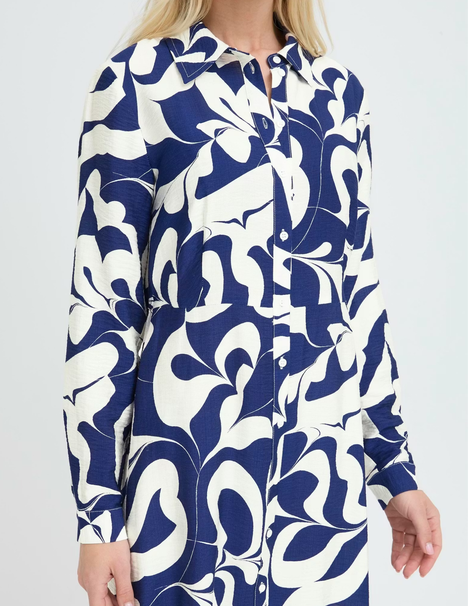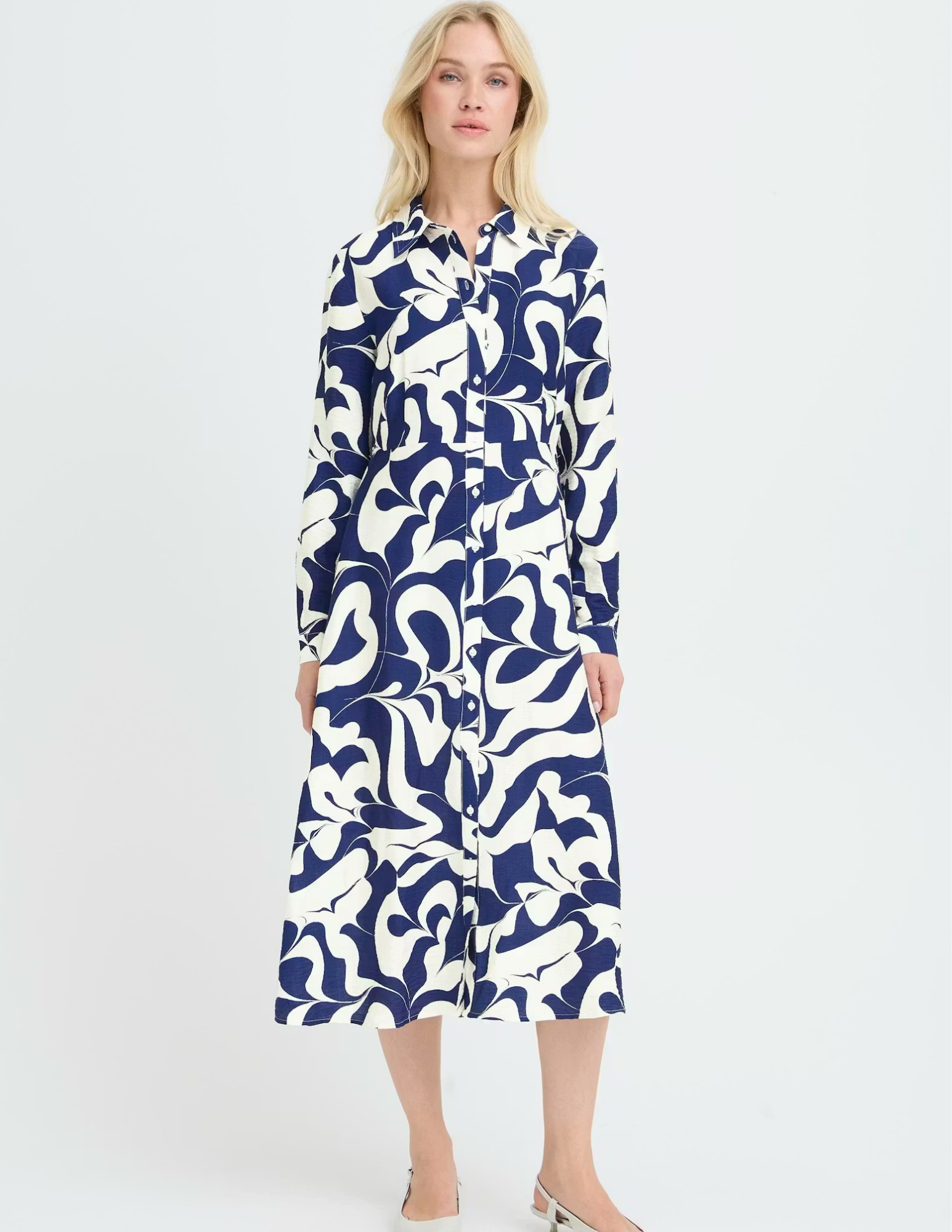 Introducing the Ikaia Shirt Dress in Navy—where medieval-inspired blue swirls meet modern sophistication. This versatile midi dress features a crisp pointed collar, long sleeves with tailored cuffs, and a full front button closure for effortless styling. The straight fit and all-over abstract pattern create an eye-catching look that transitions seamlessly from office to weekend brunch. Dress it up with heels or down with sneakers—this wardrobe essential does it all.