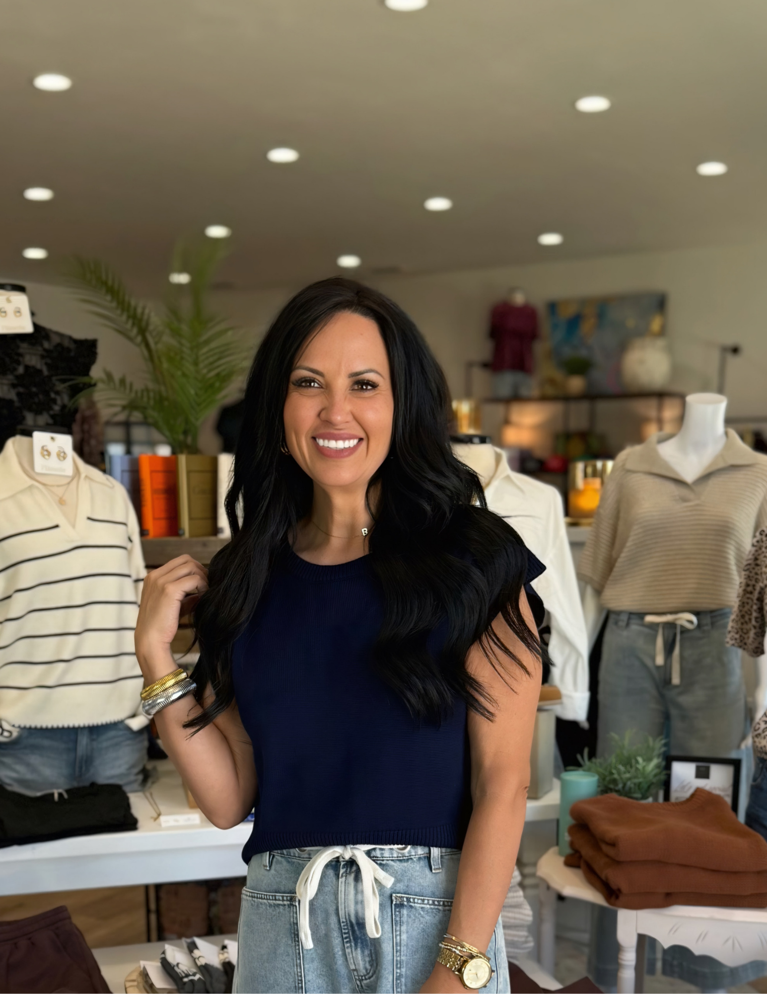 This navy knit top features charming cap sleeves and a cozy round neckline, perfect for adding a touch of casual fun to any outfit. The ribbed detailing at the hem and sleeves gives it a snug, flattering fit that’s as comfortable as it is cute. Dress it up or down—the playful style makes it your new go-to for effortless cool!