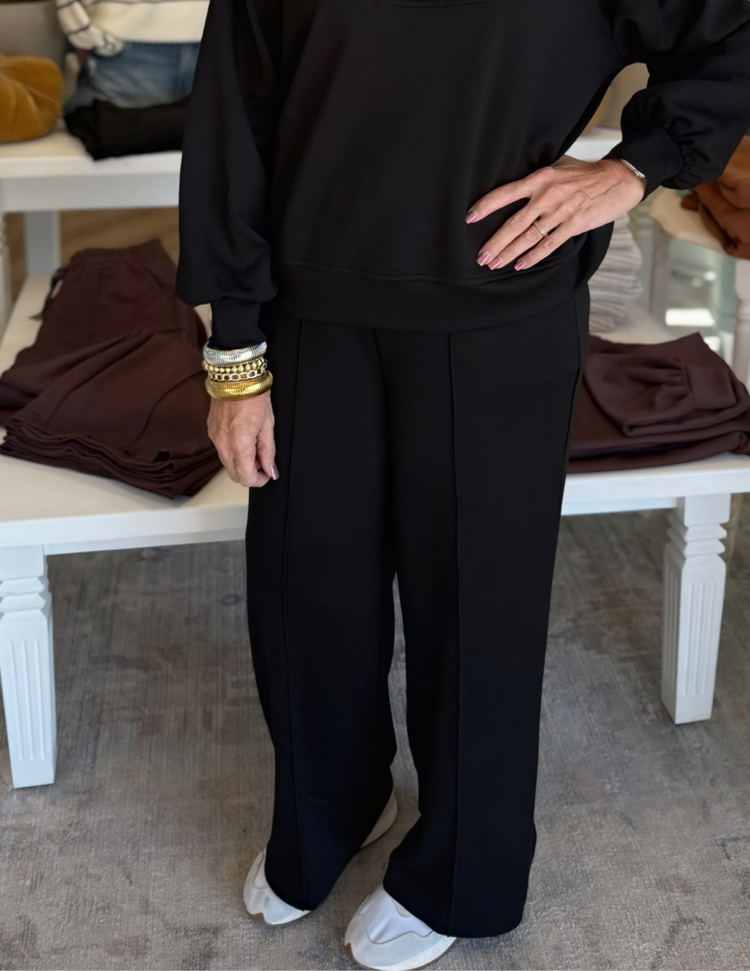 Step into comfort and style with these black knit drawstring pants. Featuring a playful wide-leg silhouette, an easy elastic waistband with a drawstring for a perfect fit, and handy side pockets, these lightweight, non-sheer pants keep you comfy all day. The front seam detail adds a chic touch, making them your new go-to for relaxed yet polished looks.