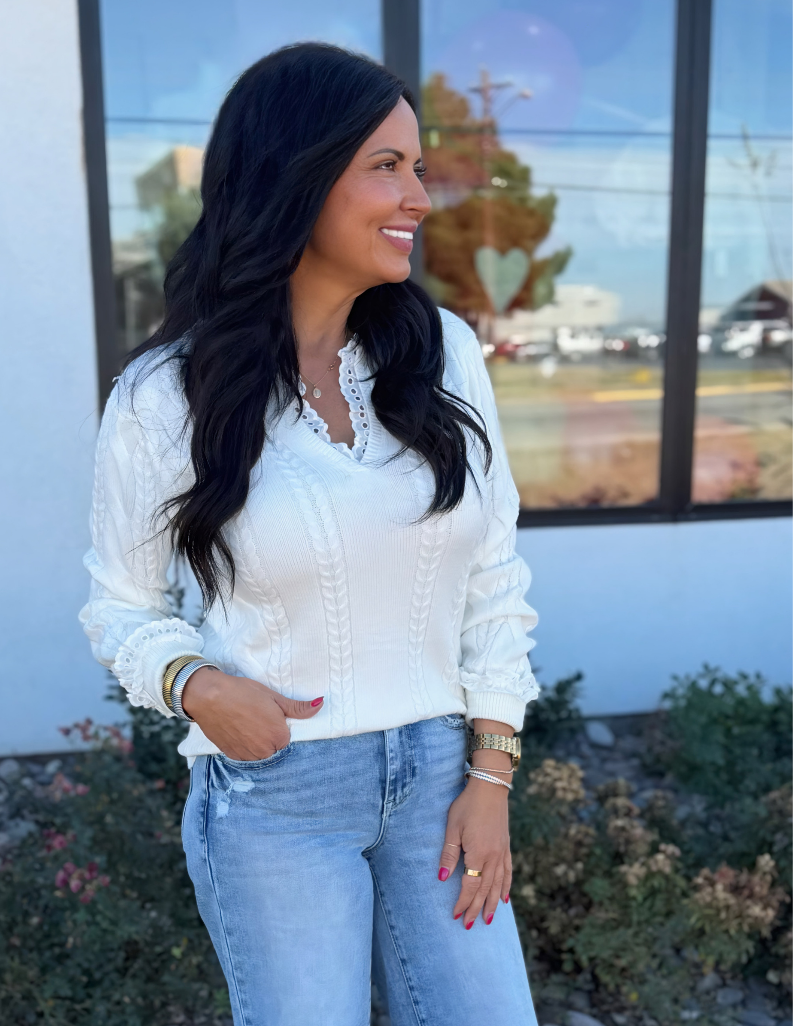 Lace Embellished V-Neck Cable Knitted Sweater- Off White