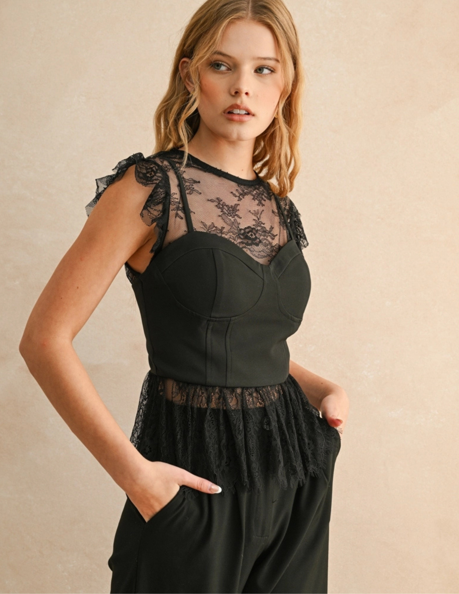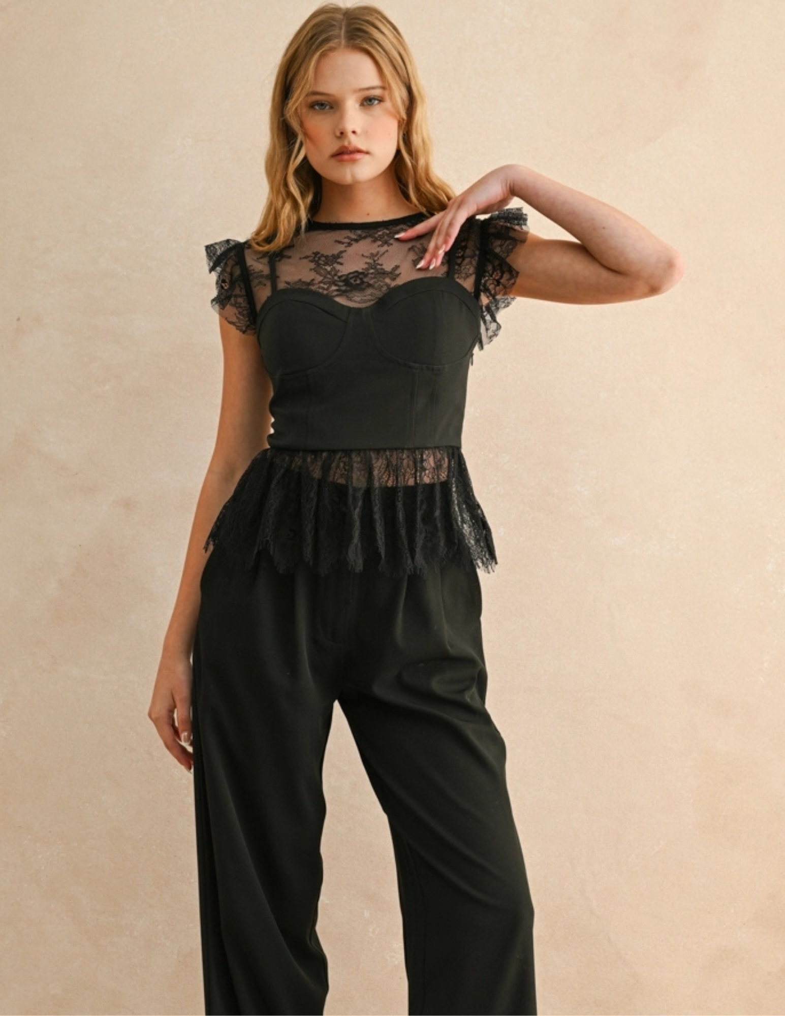Elevate your look with this playful black lace peplum blouse. Its delicate lace fabric adds a touch of romance, while the flattering peplum silhouette accentuates your waist for a fun, flirty vibe. Perfect for dressing up or down, this blouse brings effortless charm to any outfit.