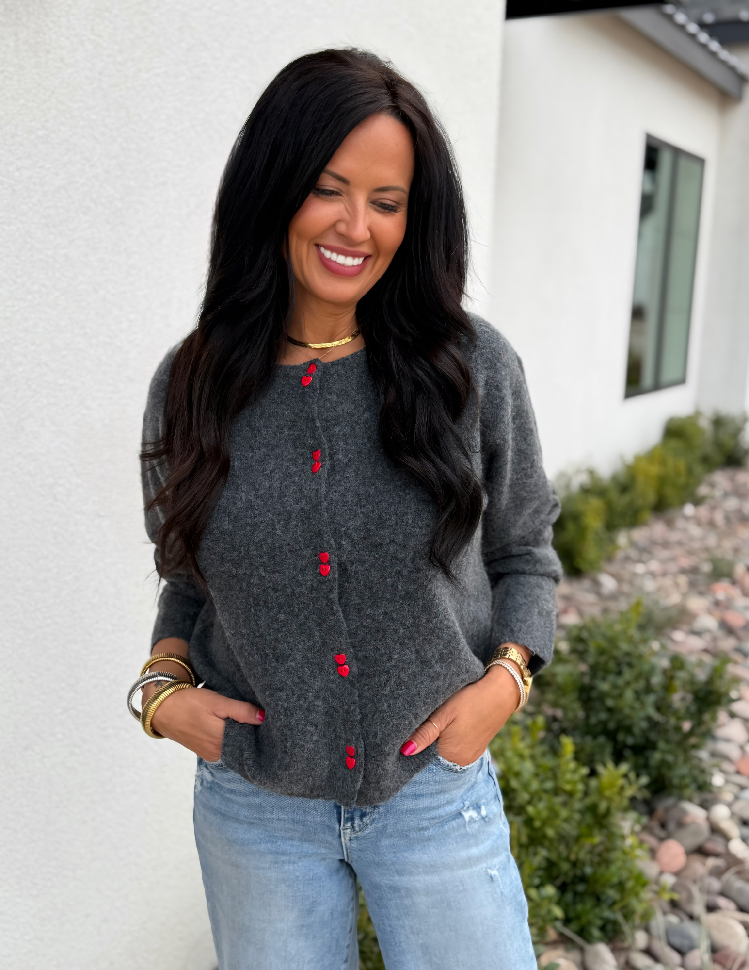 Wrap yourself in cozy charm with this delightful charcoal cardigan. Crafted from soft knit fabric, it features whimsical red heart-shaped buttons that add a playful pop of personality to your everyday look. The relaxed, boxy silhouette pairs perfectly with the crew neckline and long sleeves finished with clean cuffs, while a subtle rolled hem adds understated polish. Perfect for layering over your favorite tees or dresses—comfort meets cuteness.