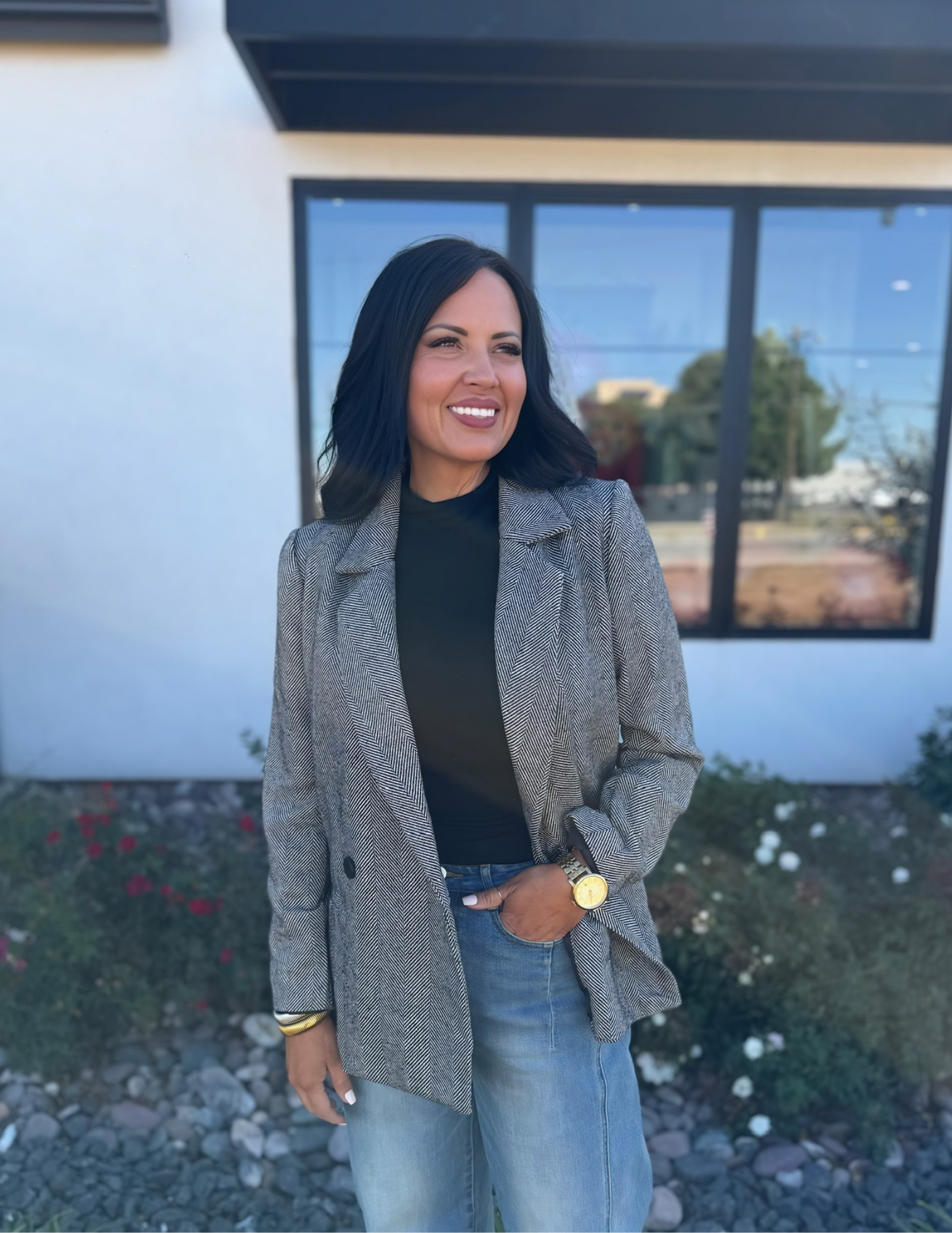 Elevate your everyday style with this chic long line blazer that's equal parts polished and fun. Featuring a sharp notch collar, buttoned cuffs, and clever mock pocket tabs, it's designed to make a statement. The chevron plaid pattern adds visual interest while the extended length creates a flattering silhouette that works beautifully layered over dresses or paired with your favorite trousers. Button details throughout keep things refined, making this blazer your new go-to for looking put-together without trying too hard.