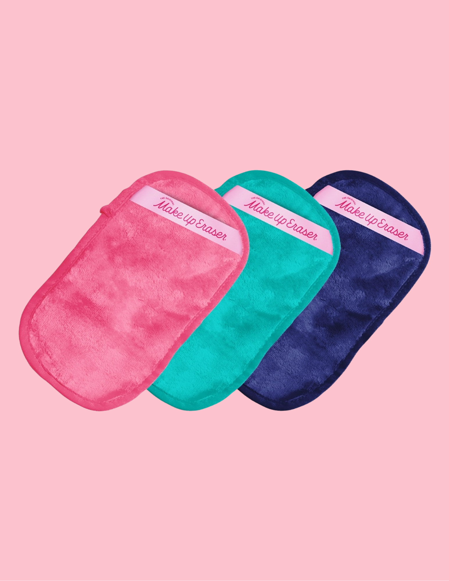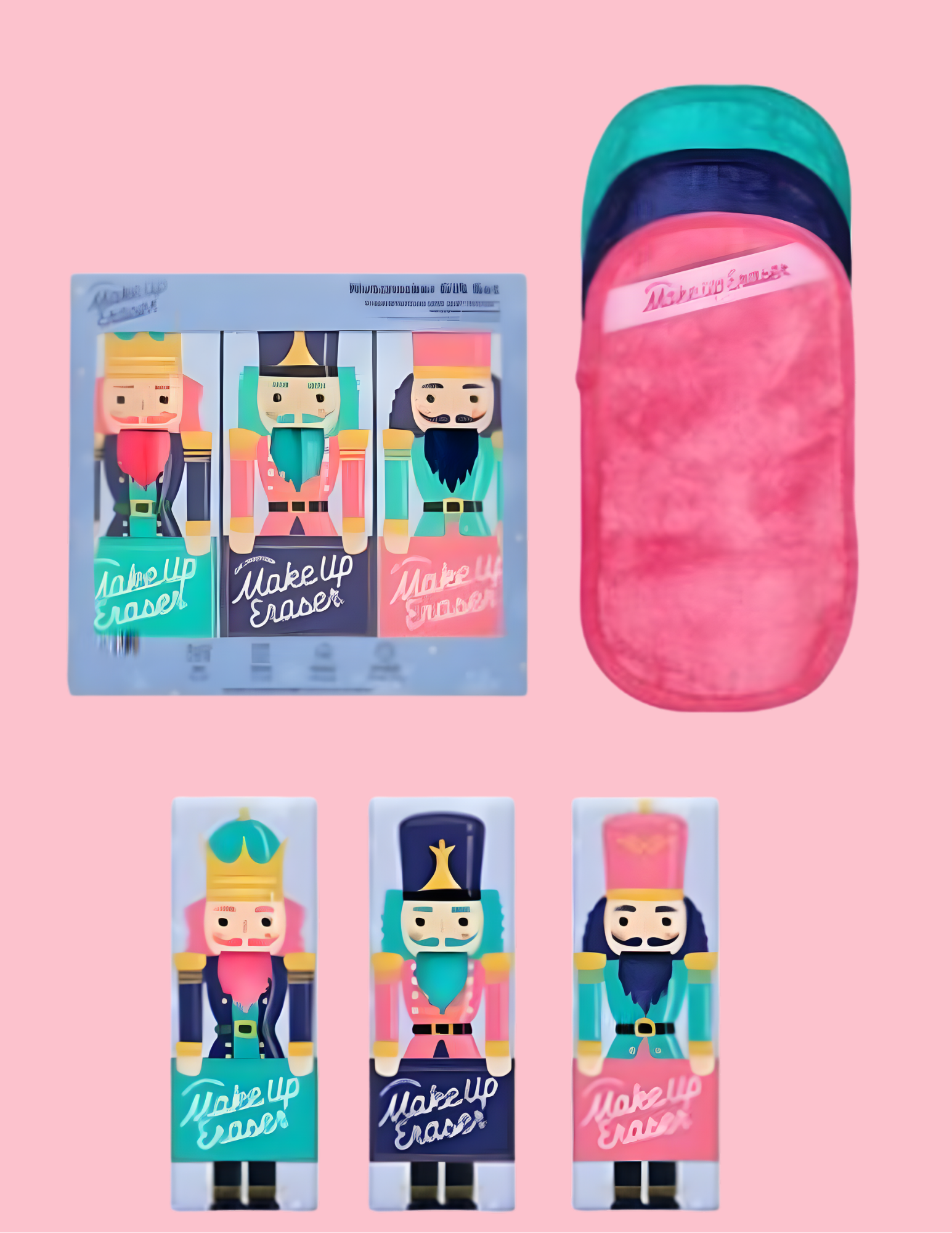 Get holiday-ready with this festive trio of Mini PRO MakeUp Erasers! Each 8" x 4" cloth features our patented water-activated fibers that dissolve makeup—even waterproof formulas—using just water. One side tackles stubborn makeup, masks, and sunscreen while the other gently exfoliates for a radiant finish. Perfect for gifting or stocking your beauty routine, these individually boxed erasers bring the magic of effortless cleansing to your daily routine. No harsh chemicals, no tugging, just pure makeup-melting bliss!