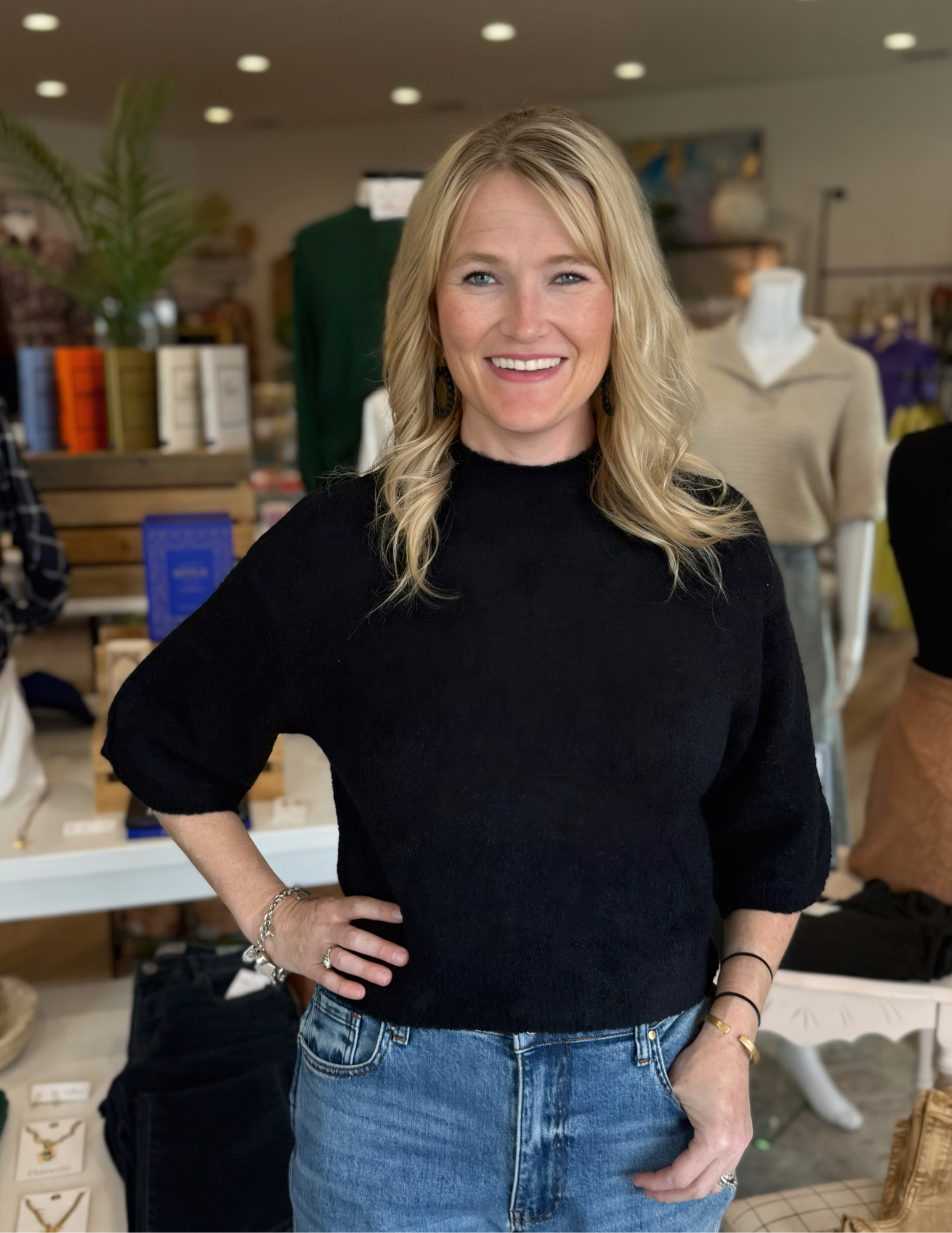 Cozy meets chic in this black three-quarter knit sweater! Featuring a flirty mock neck and soft boucle texture, it’s perfect for layering without overheating. The medium-weight, non-sheer fabric keeps you comfy and stylish through every season. Effortless cool with a playful twist!