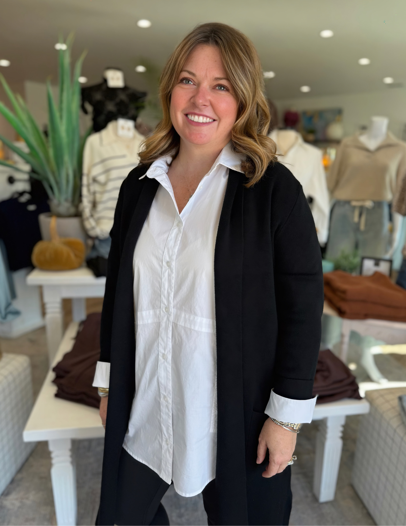 Stay cozy and chic in this playful black open knit cardigan. With its breezy stitched design and front pockets, it adds both comfort and function to your outfit. Falling just above the knee, it’s perfect for layering over your favorite looks and adding a touch of effortless style.