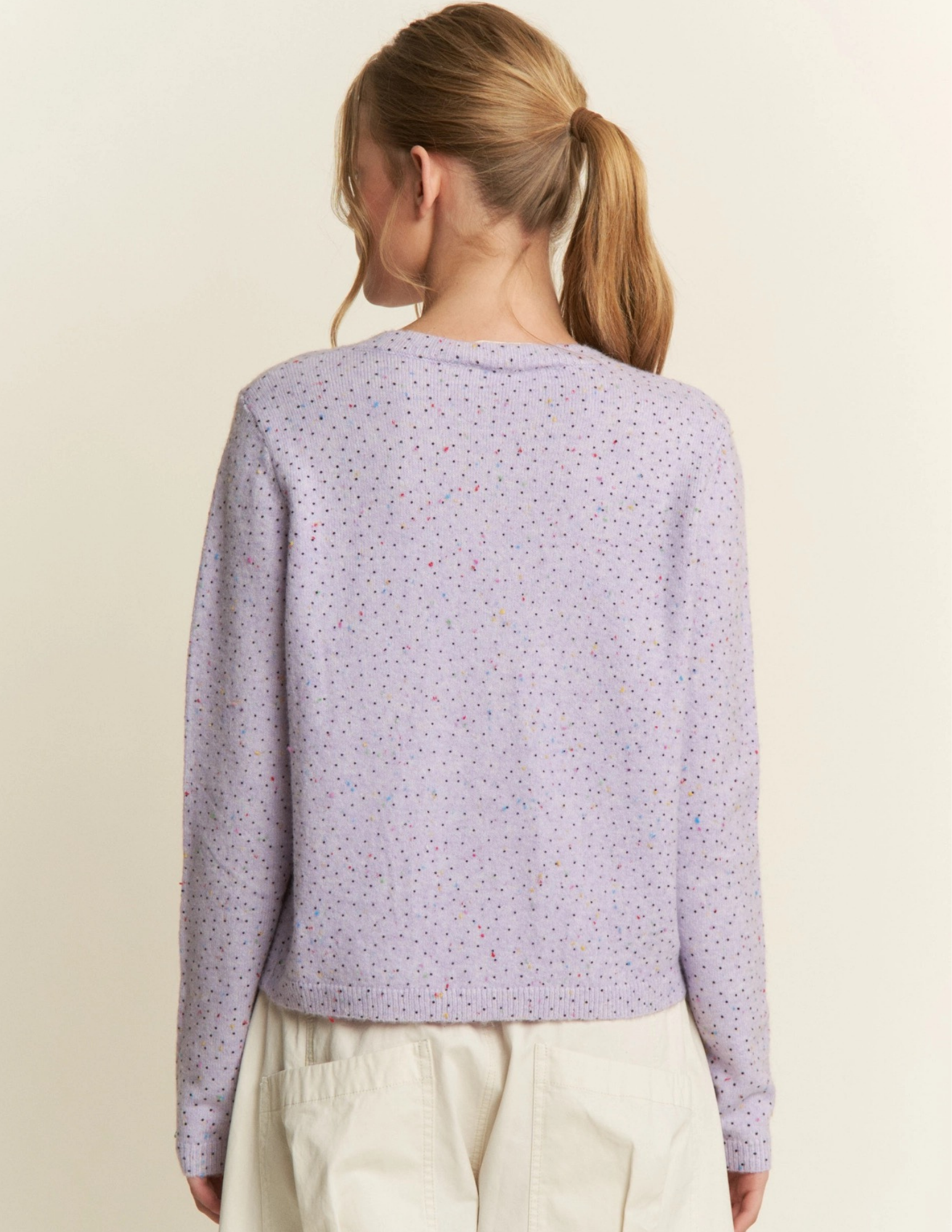Layer up with timeless charm in this lavender cardigan, dotted with playful polka dots for a touch of whimsy. The long-sleeve knit features a classic button-front closure and crew neckline, while ribbed cuffs and hem keep everything polished and put-together. Perfect for adding personality to any outfit—whether you're dressing it up or keeping it casual.