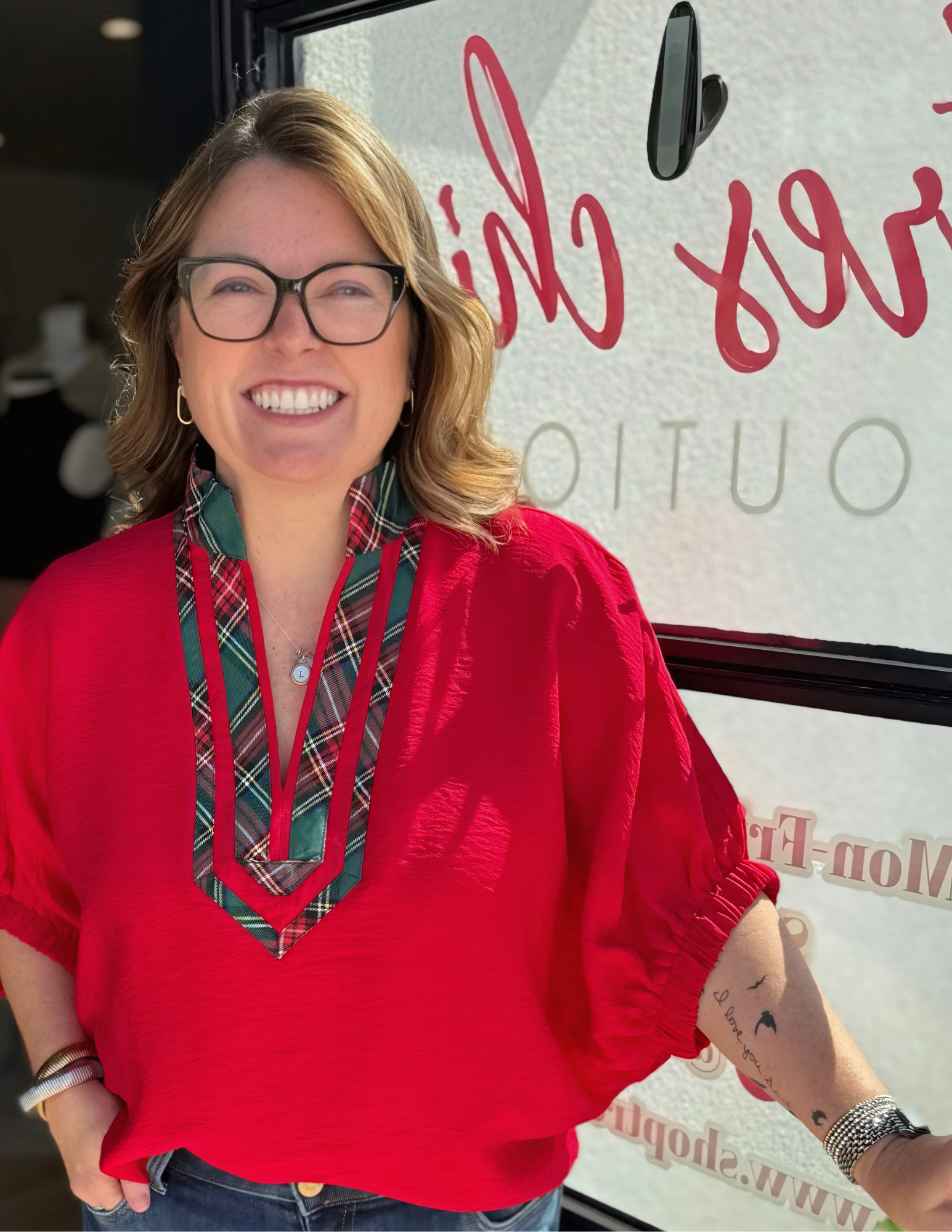 Add a splash of fun to your wardrobe with this Red Dolman Top! Featuring breezy short sleeves and a playful plaid contrast on the high V-neck band, it offers a stylish twist on a classic silhouette. Lightweight and non-sheer, this woven top keeps you comfortable and confident all day long. Perfect for mixing and matching with your favorite jeans or skirts!