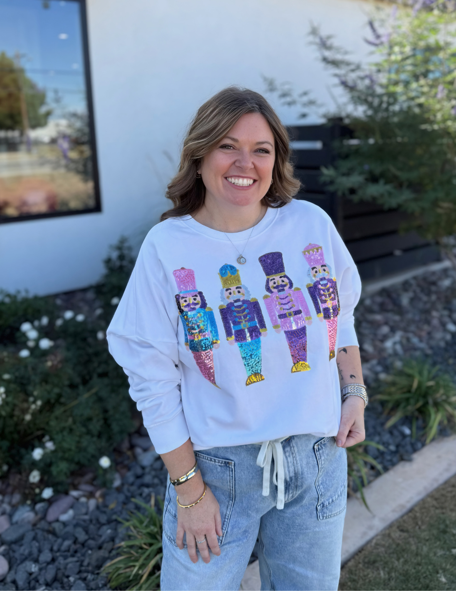Deck the halls in festive style with this oversized sweatshirt featuring playful nutcracker designs adorned with shimmering multi-color sequins. The soft white base pairs perfectly with the eye-catching sparkle, making it an instant holiday favorite. Perfect for cozy gatherings, seasonal celebrations, or anyone who loves a little extra shimmer in their wardrobe. Comfortable, fun, and undeniably merry.