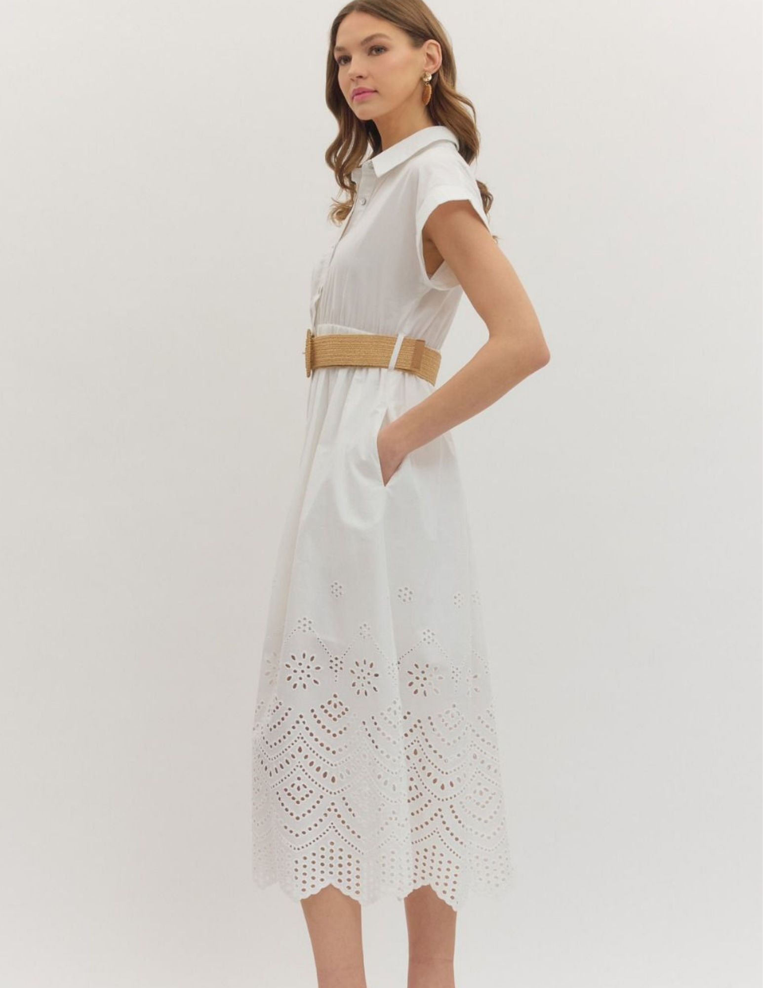 Short cuff sleeve midi dress featuring eyelet embroidered scallop hem. Button closure at front. Detachable woven belt with round buckle. Side pockets. Lined. Woven. Non-sheer. Lightweight.