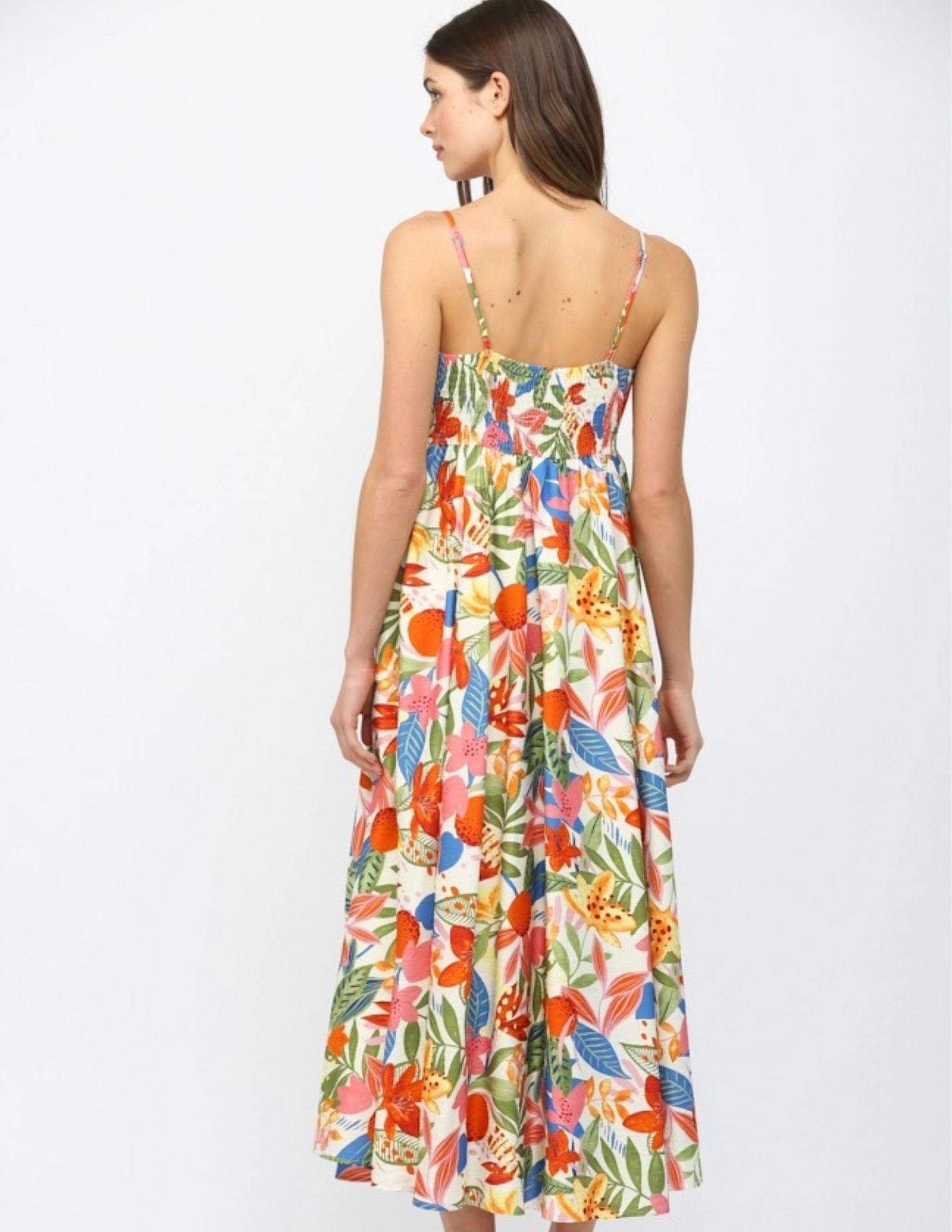 Effortless summer style meets timeless elegance in this charming midi dress. Delicate spaghetti straps frame the shoulders while a playful front bow tie adds a touch of sophistication. The front slit provides ease of movement and a hint of allure, making it perfect for warm-weather occasions. Versatile enough for brunch, garden parties, or casual evenings out.