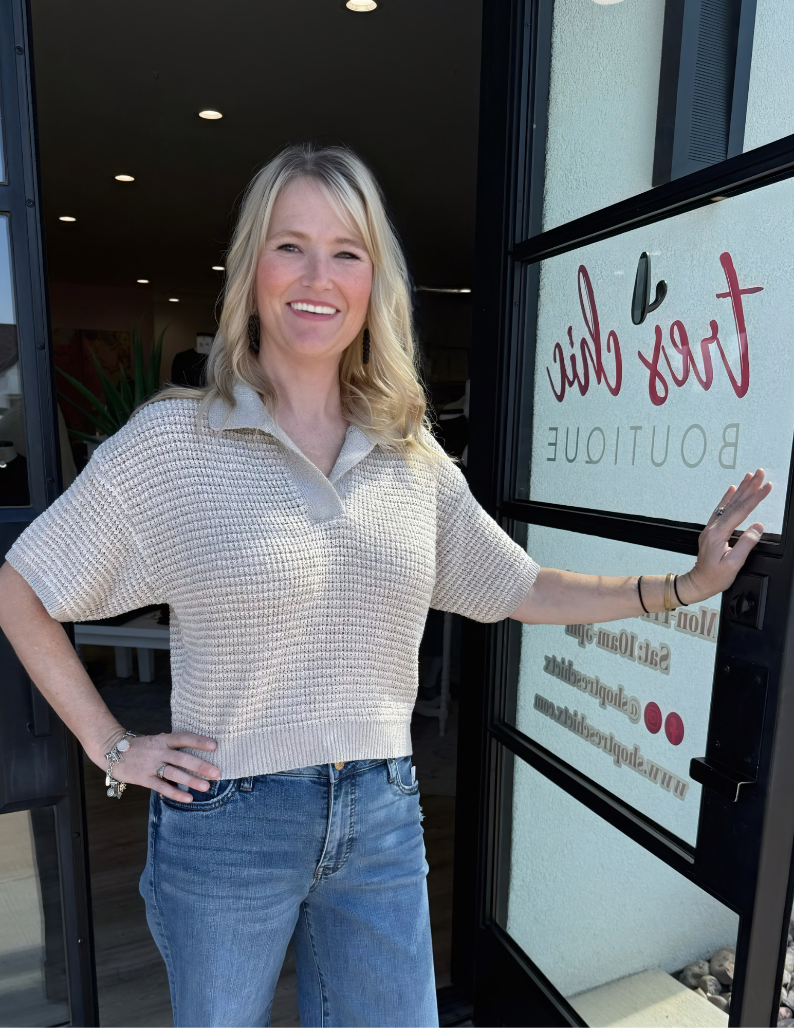 Bring casual charm to your wardrobe with this taupe collared knit top. Featuring a cozy knit texture in taupe and white, its v-neck and short sleeves create a breezy, flattering look. The classic collar adds a touch of playful sophistication, perfect for mixing and matching with your favorite jeans or skirts. Ready to brighten your everyday style? This top is a comfy, cute choice!