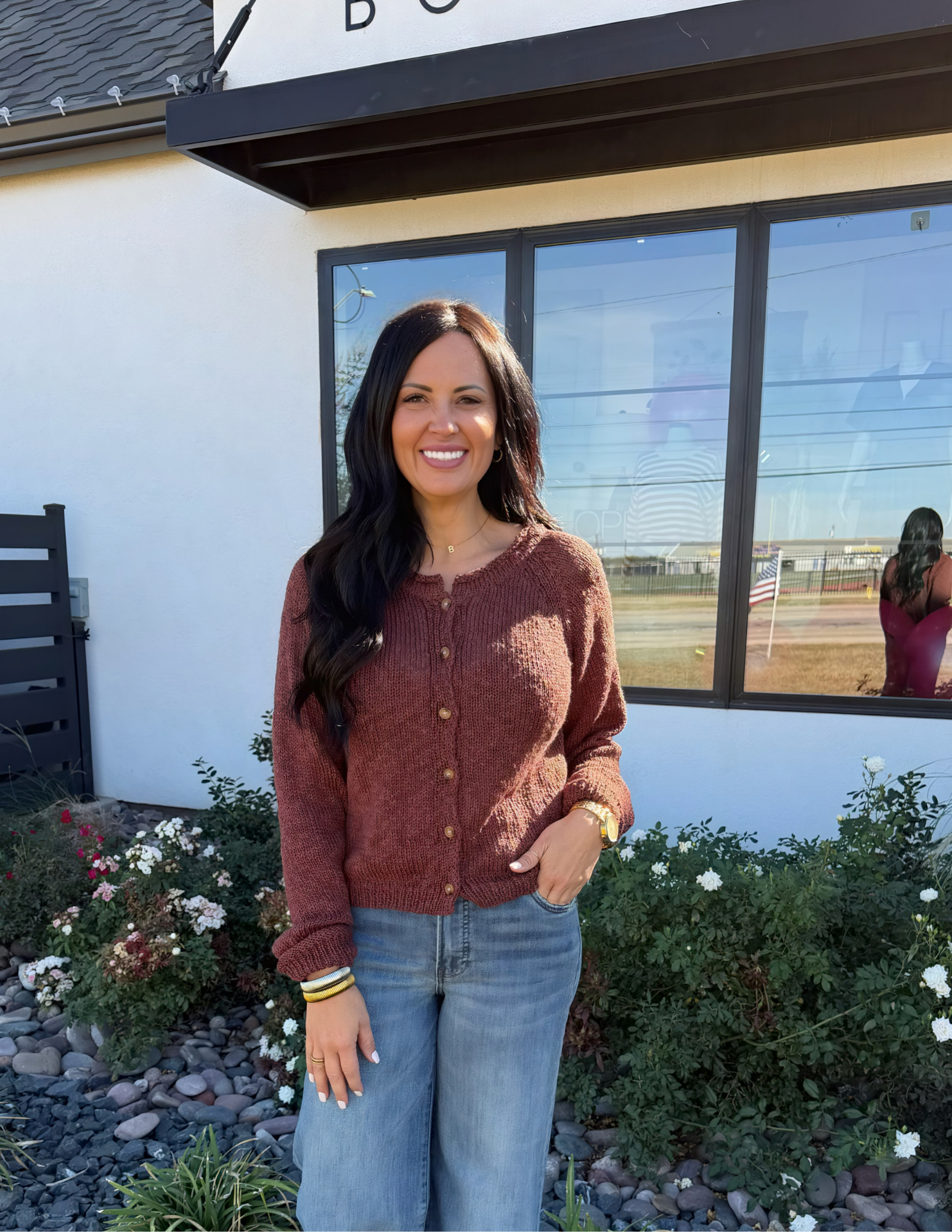 Slip into effortless style with this cognac cardigan that's basically your new best friend. The soft textured knit feels amazing against your skin, while the relaxed fit and raglan sleeves make layering a breeze—or wear it solo as a chic standalone piece. Button-down front, ribbed hems, and that perfect round neckline? Chef's kiss. Whether you're dressing up basics or adding warmth to your favorite outfit, this versatile cardigan does it all with understated charm.